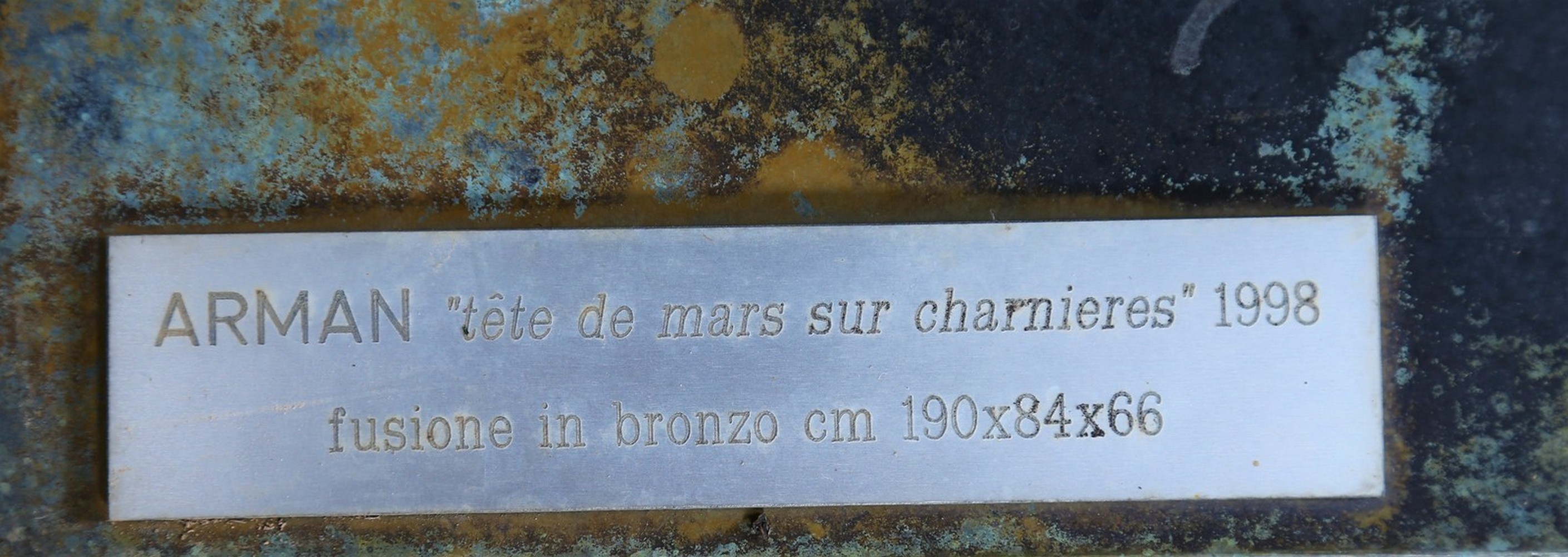 ARMAN FERNANDEZ (1928 - 2005) Tete de mars sur charnieres. 1998. Bronzo. Cm 84,00 x 190,00 x 66,00. 4/6. Tiratura e firma incisi alla base. Opera archiviata presso l'Archivio delle opere di Arman presso la galleria Dante Vecchiato, coma da documentazione fotografica allegata all'opera riportante il relativo numero d'inventario. Provenienza: Agnellini Arte Moderna, Brescia (certificato allegato all'opera); Collezione privata, Brescia.