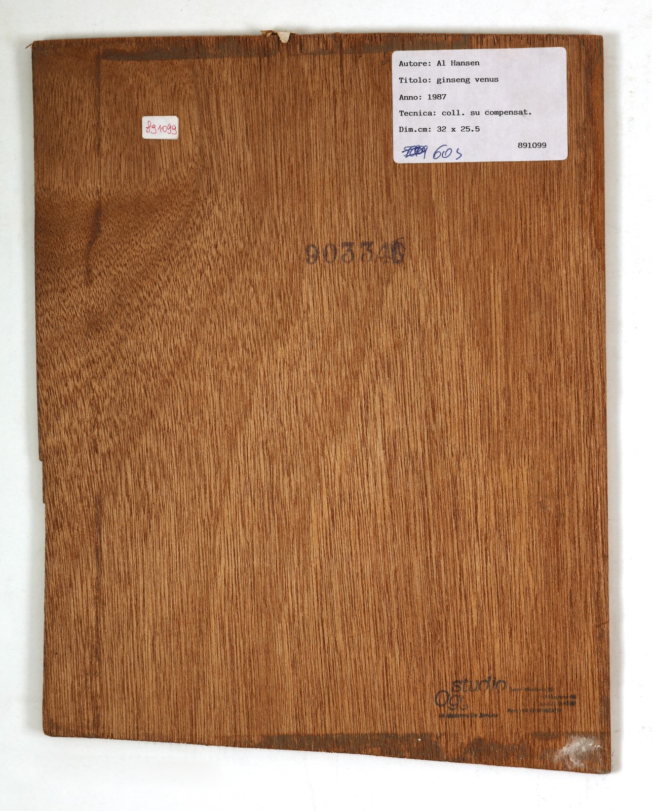 HANSEN AL (1927 - 1995) Ginseng venus. 1987. Mixed nomes on board. Cm 25,00 x 32,00. Title lower left, signature and year lower right. At the back Studio Oggetto stamp.