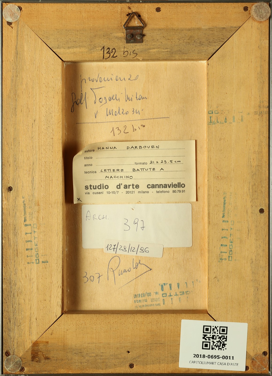 DARBOVEN HANNE (1941 - 2009) Untitled. Mixed media on paper. Cm 21,00 x 29,50. Signature lower centre. At the back Cannaviello Art Gallery, Milan label and Studio Oggetto stamp. Cornice presente
