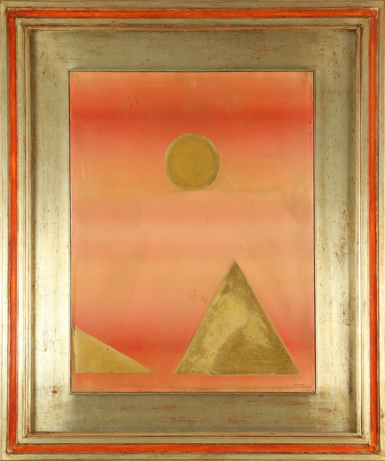GRIBAUDO EZIO (n. 1929) Fuoco all'alba. 1973. Olio su tela . Cm 60,00 x 80,00. Firma in basso a destra. Al retro titolo, firma, anno e cartiglio descrittivo Galleria d'arte Davico. Pubblicazione: Gribaudo a cura di Mario Tosi, 30 Ottobre -20 Novembre 1973, Torino, pag.15. Cornice presente