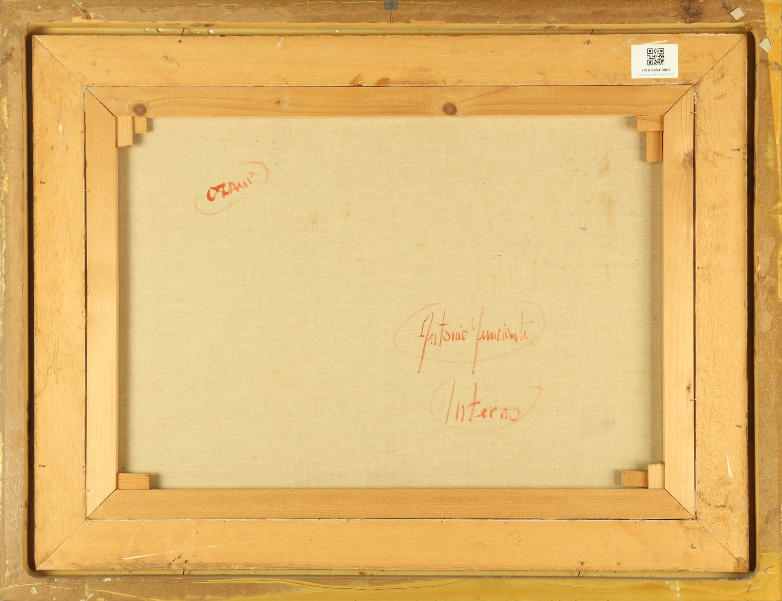 NUNZIANTE ANTONIO (n. 1956) L'interno. . 1987. Olio su tela . Cm 70,00 x 50,00. Firma in basso a destra. Al retro firma e titolo. Opera archiviata presso l'Archivio Nunziante come da documentazione fotografica allegata all'opera riportante il relativo numero d'inventario. . Cornice presente