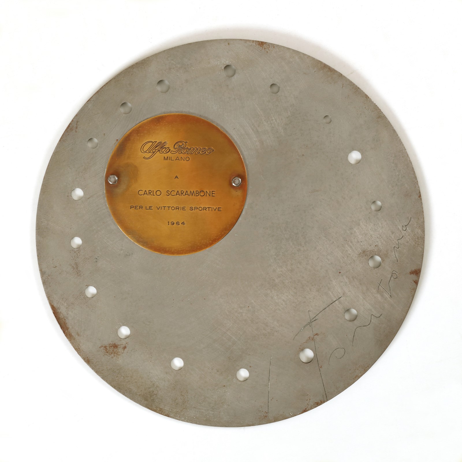 FONTANA LUCIO (1899 - 1960) Discus. 1964. . Cm 27,00 x 27,00. Engraved signature and a prize-giving plaque dedicated to Carlo Scarambone on the front. Discus was commissioned by Alfa Romeo in 1964 to Lucio Fontana and produced in130 copies to be handed to the best drivers as a prize for their victories in that year. Carlo Scarambone was Alfa Romeo's official pilot from 1962 to 1965. Bibliography: Obiettivo e trofei, 20 sculture per 10.000 vittorie, Alfa Romeo publisher, 1983, p.6 and 16. A non-dedicated copy is present at the Museum Fratelli Cozzi, Legnano. Thanks to Elisabetta Cozzi for the kind assistance and the precious informations..
