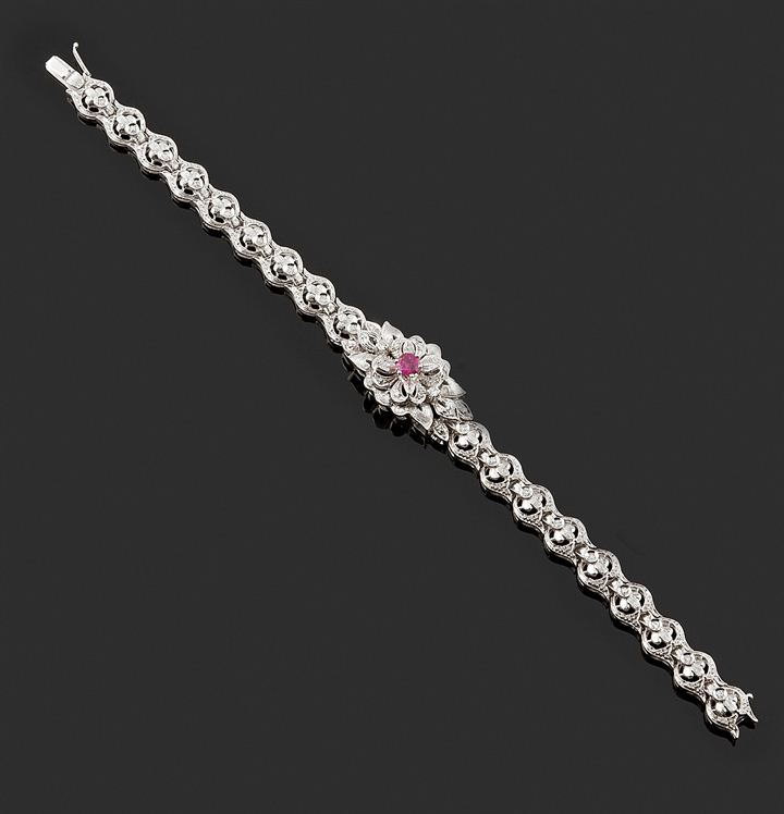 Bracciale in oro bianco, lavorato a motivi vegetali, con al centro piccolo rubino di taglio ovale e
