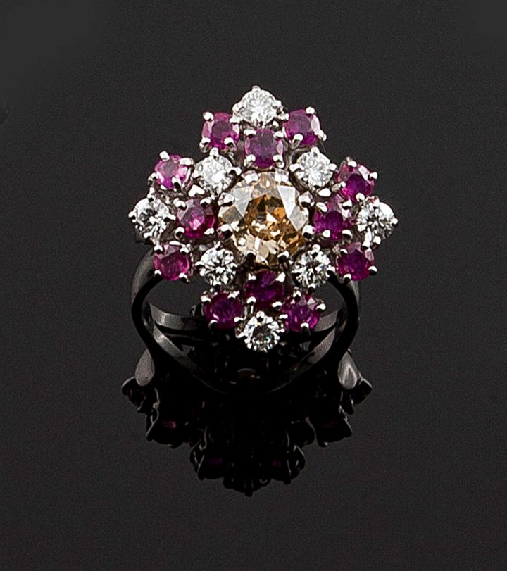 Anello in oro bianco, a forma di cespuglio, con diamante centrale di colore cognac di ct 1,42 ca, contorno