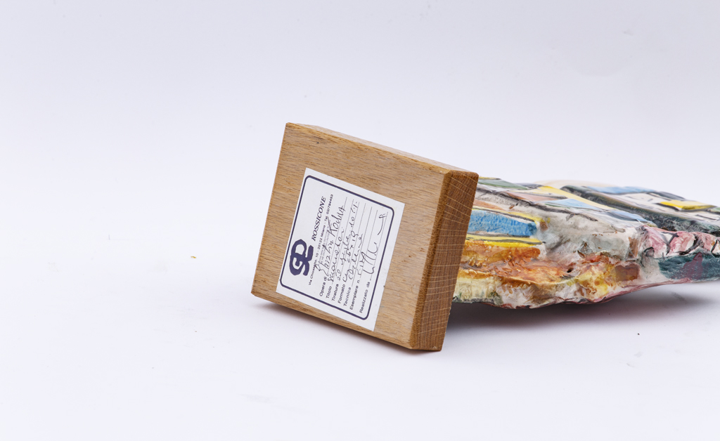 Etichetta delle Ceramiche Rossicone (MI) con firma, titolo, misure e numerazione (Esemplare P.A.) sotto la base
