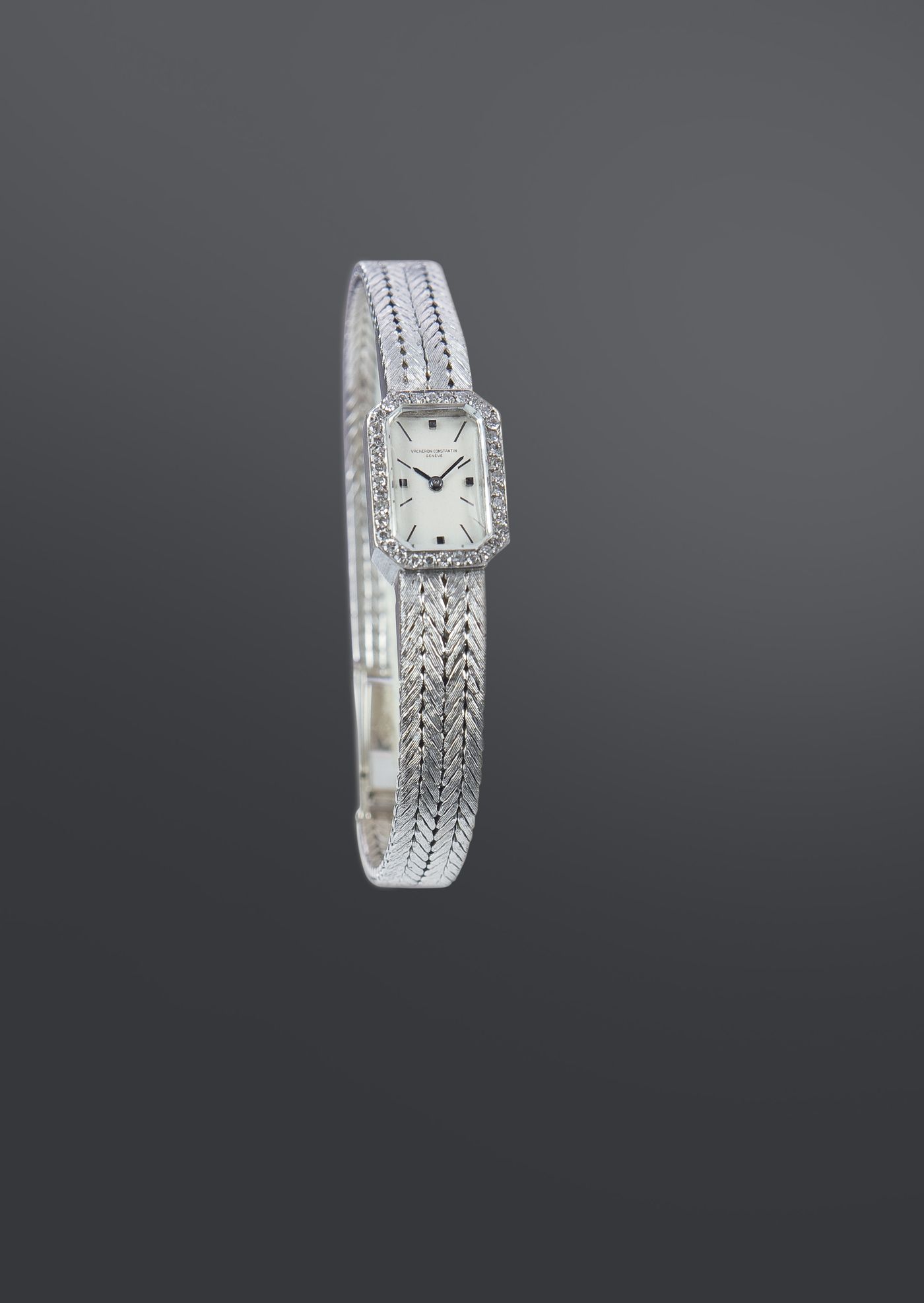 VACHERON & CONSTANTIN Orologio gioiello, di forma, anni '40 16,5x12 Cassa e bracciale in oro bianco con lunetta in diamanti taglio brillante rotondo; quadrante argenté con indici applicati, lancette azzurrate Movimento a carica manuale