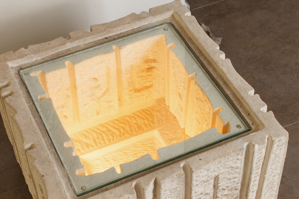 NINO CASSANI (1930)Senza TitoloScultura in pietra, vetro e lampadinecm 37x52x52