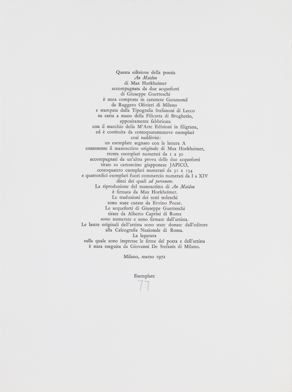 Cartella contenente 2 acqueforti di Giuseppe Guerreschi e 1 poesia di Max Horkheimer