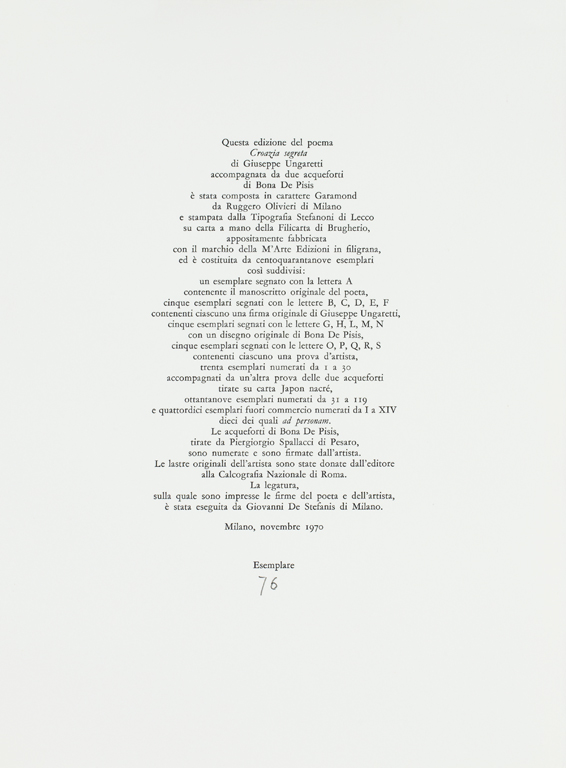 Firma e numerazione (Esemplare 76/134) a matita al fronte di ciascuna acquaforte