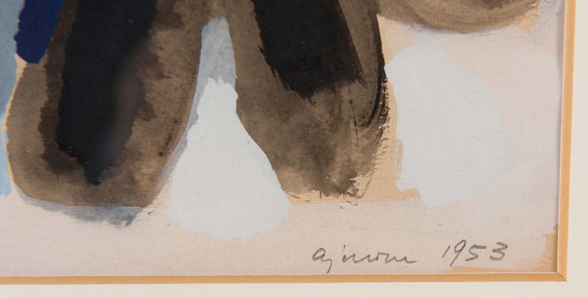Giuseppe Ajmone (Carpignano Sesia 1923 – Romagnano Sesia 2005), “Senza Titolo”, 1953. Tecnica mista su carta, firmata e datata in basso Ajmone 1953, H cm 26.5x61