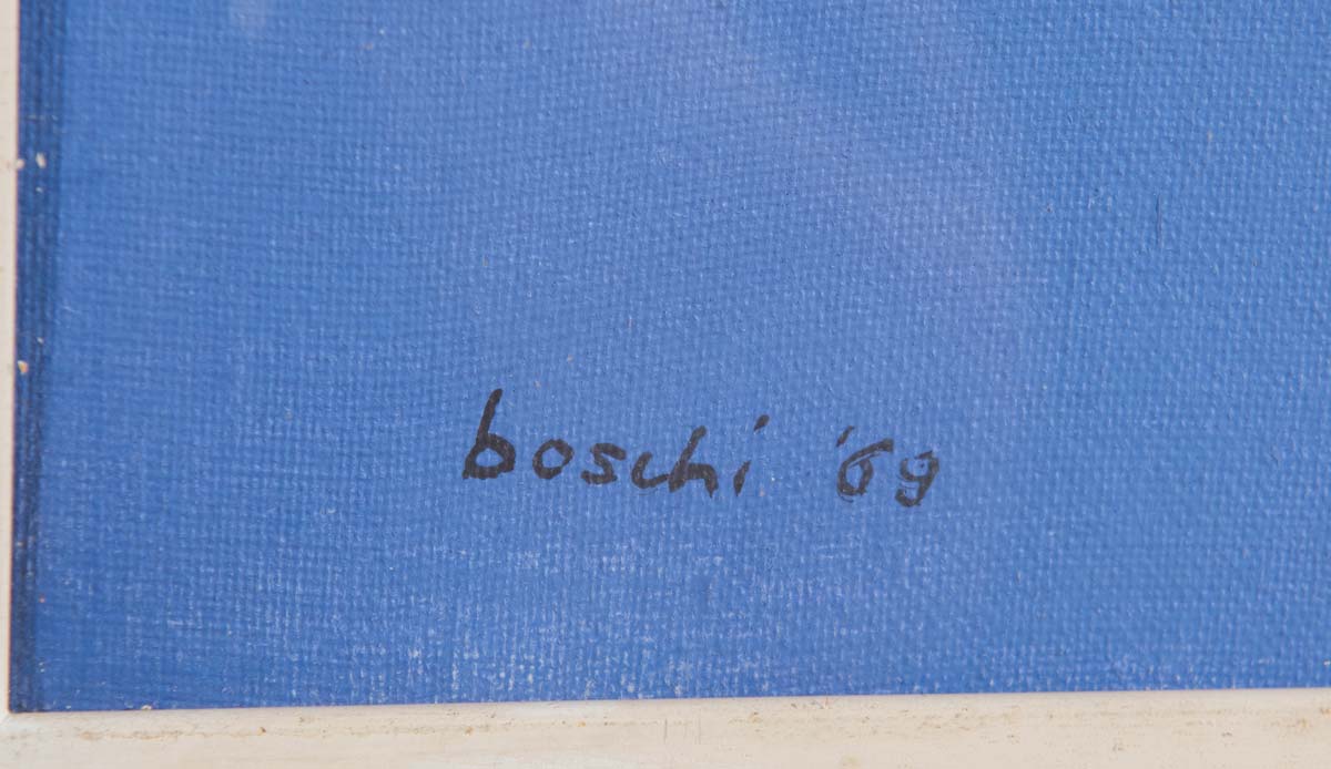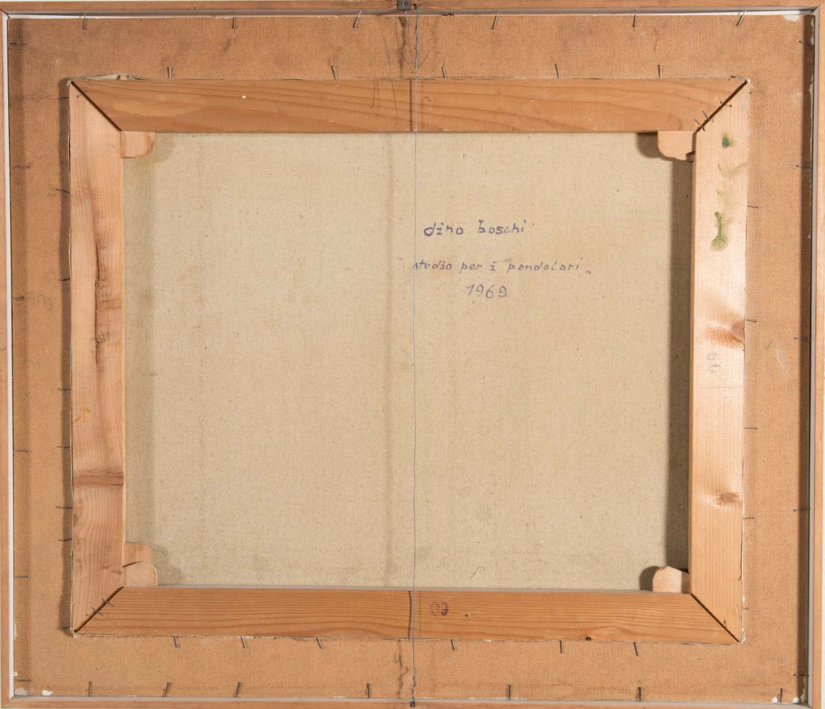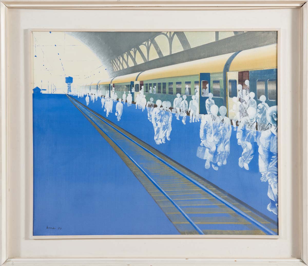 Dino Boschi (Bologna 1923 – 2015), “Studio per i pendolari”, 1969. Olio su tela, firmato in basso a sinistra Boschi 69, al retro reca firma, data e titolo ‘Dino Boschi – Studio per i pendolari – 1969’, H cm 50x60