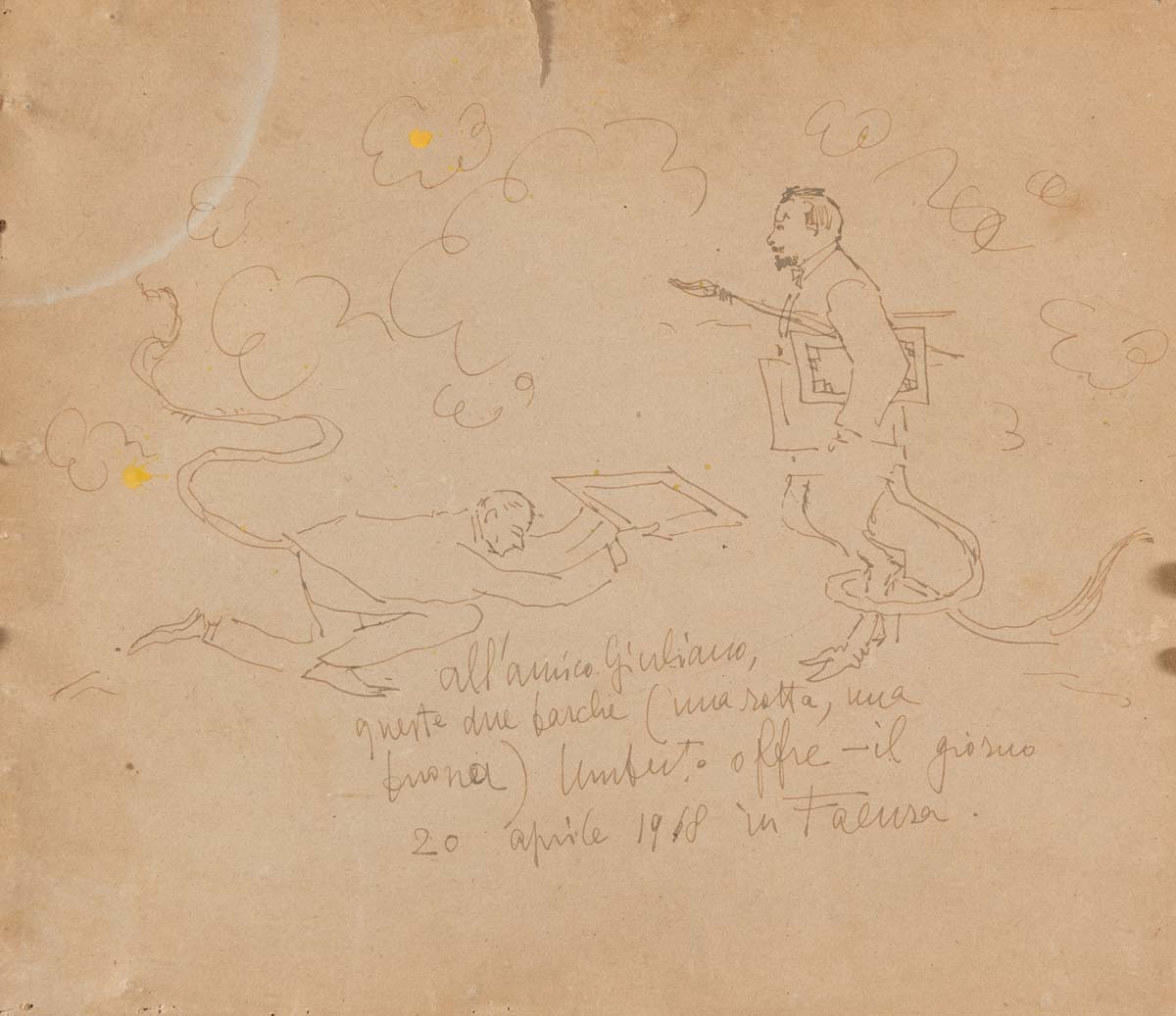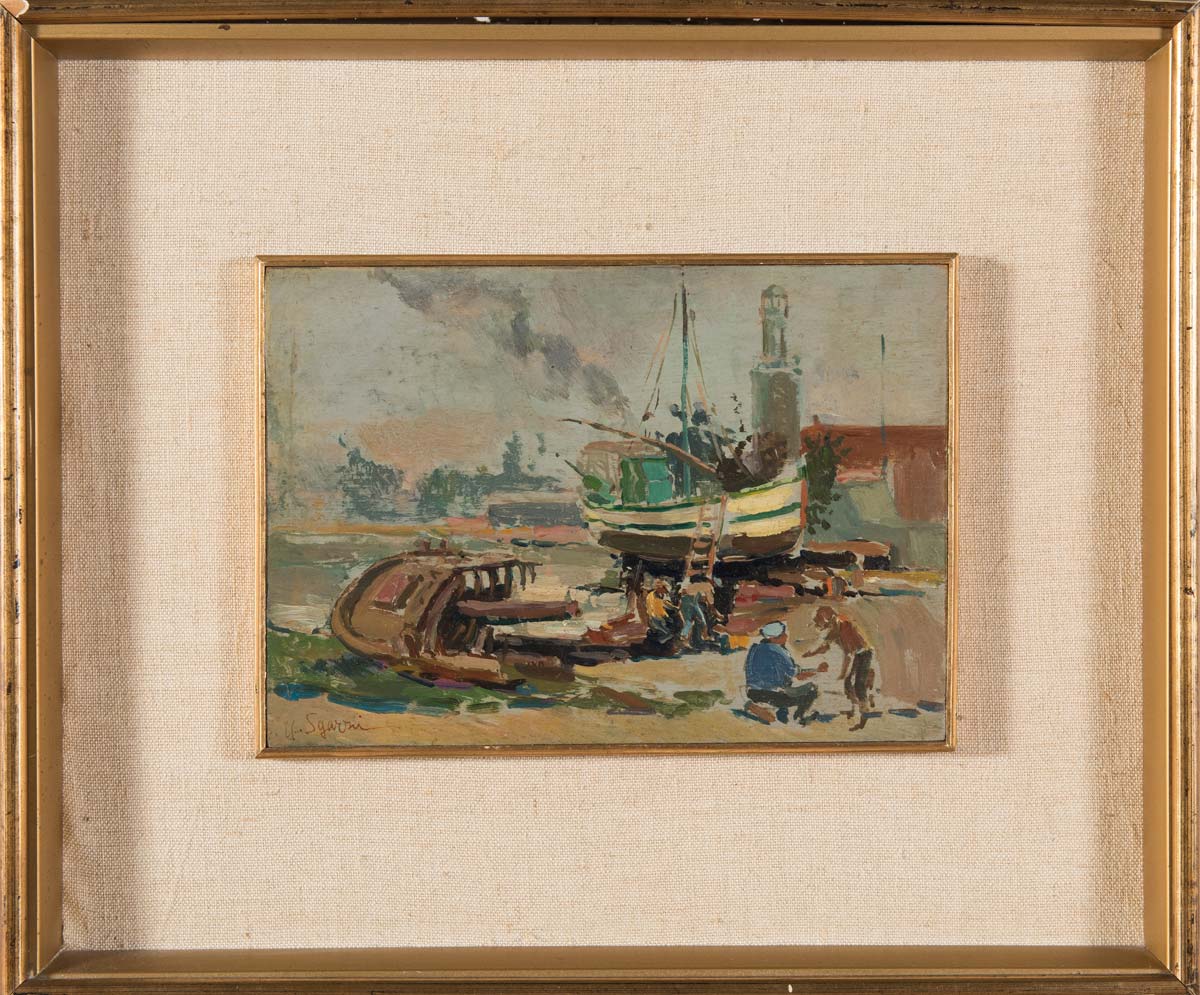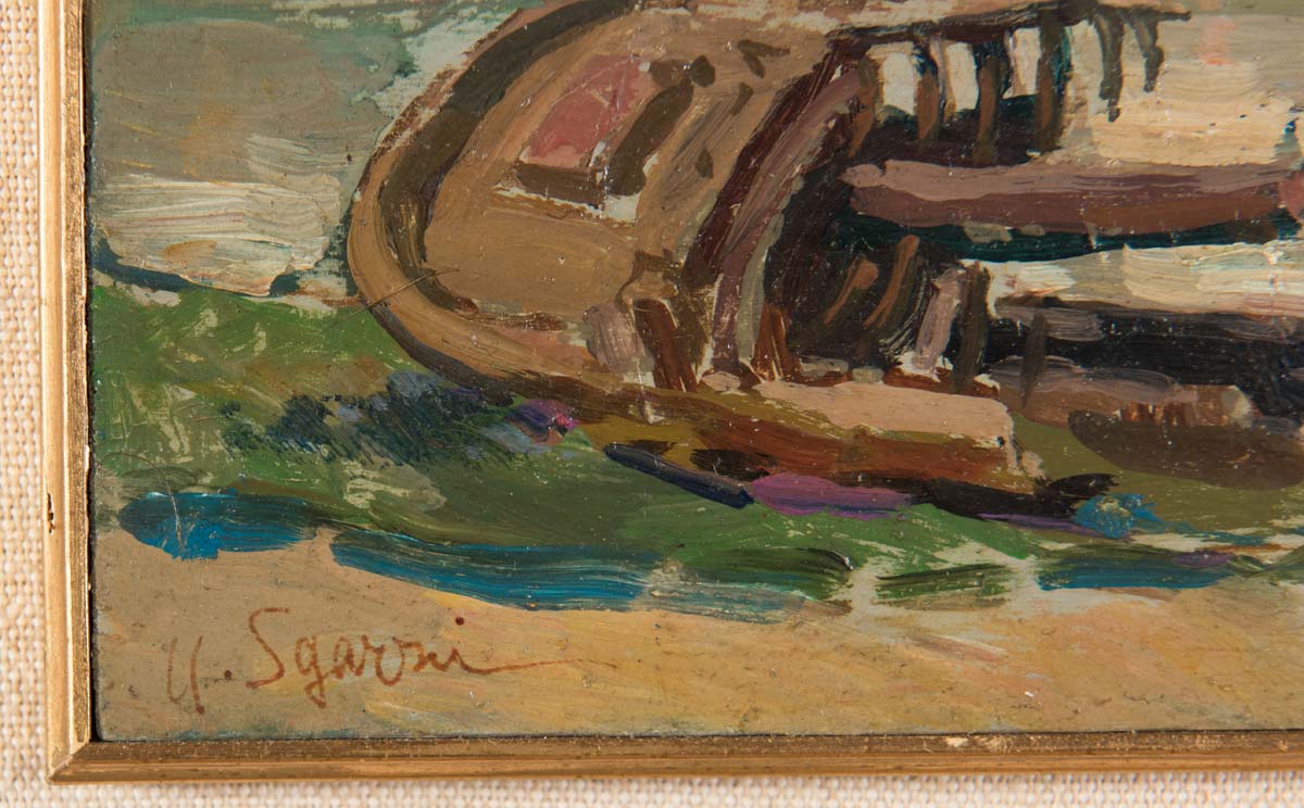 Umberto Sgarzi (Bologna 1921 – 2017, “Senza Titolo”. Olio su tavola, firmato in basso a sinistra Umberto Sgarzi, al retro reca dedica con vignetta, H cm 17x24.5