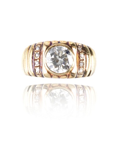 ANELLO IN ORO GIALLO E DIAMANTE al centro un diamante taglio brillante rotondo di ct 1.70 circa entro montatura a fascia bombata in oro decorata da due linee di piccoli brillanti, punzone 750, g 7,4 mis. 14 Stato di conservazione complessivo ottimo. Colore stimato del diamante taglio brillante rotondo L, purezza I1, per quanto permette la montatura. DIAMOND AND YELLOW GOLD SOLITAIRE RING Overall excellent condition. Estimated diamonds colour L, clarity I1, as observed within the limitations of the mount.