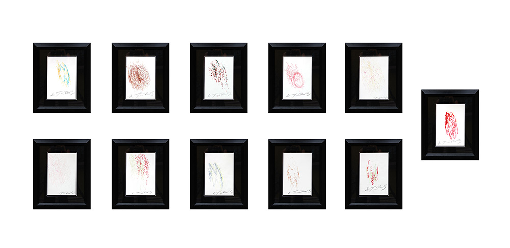 Jean TINGUELY (Friburgo 1925 Berna 1991) Senza titolo 1972 Méta-Matic e tecnica mista su carta applicata su cartoncino cm. 30 x 19"Jean Tinguely. Metamatic", Associazione Culturale Studio Soligo, Roma 2010Lotto composto da 11 opere incorniciate: ogni opera misura cm 30x19 (la misura è riferita al foglio); è stata eseguita per una performance a Parigi nel 1972 e presenta la firma dell'artista "Jean Tinguely" (in basso) Timbro della performance con i relativi dati (al retro) Lotto composto da 11 opere incorniciate: ogni opera misura cm 30x19 (la misura è riferita al foglio); è stata eseguita per una performance a Parigi nel 1972 e presenta la firma dell'artista "Jean Tinguely" (in basso) Timbro della performance con i relativi dati (al retro)