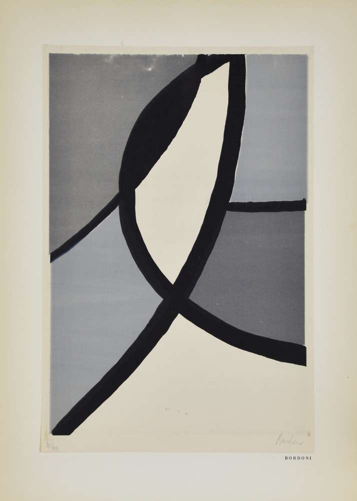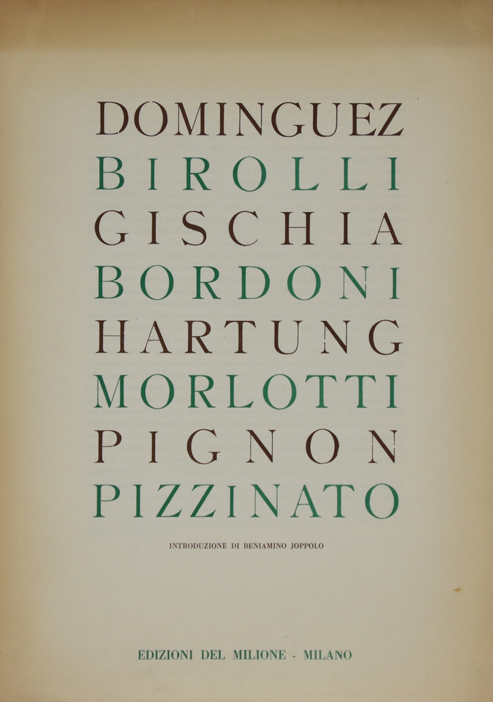 Artisti vari XX secolo CARTELLA EDIZIONI IL MILIONE Serie completa di 16 litografie edita in 100 esemplari da Edizioni del Milione di Milano. Due litografie firmate a matita per ciascuno degli otto artisti: Dominguez, Birolli, Gischia, Bordoni, Hartung, Morlotti, Pignon e Pizzinato. Tavole a margini editoriali in ottimo stato di conservazione salvo leggere tracce di polvere ai margini. Cartella editoriale frammentata e danneggiata. (16)