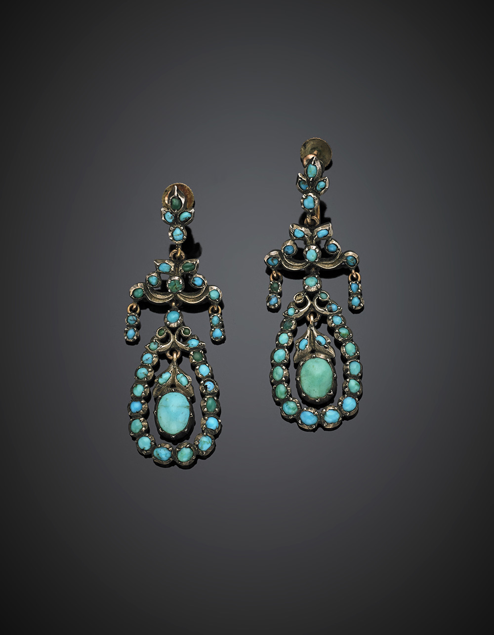 Yellow 9K gold and silver cabochon turquoise pendant earrings, g 14.13, length cm 5.40 circa. (losses)