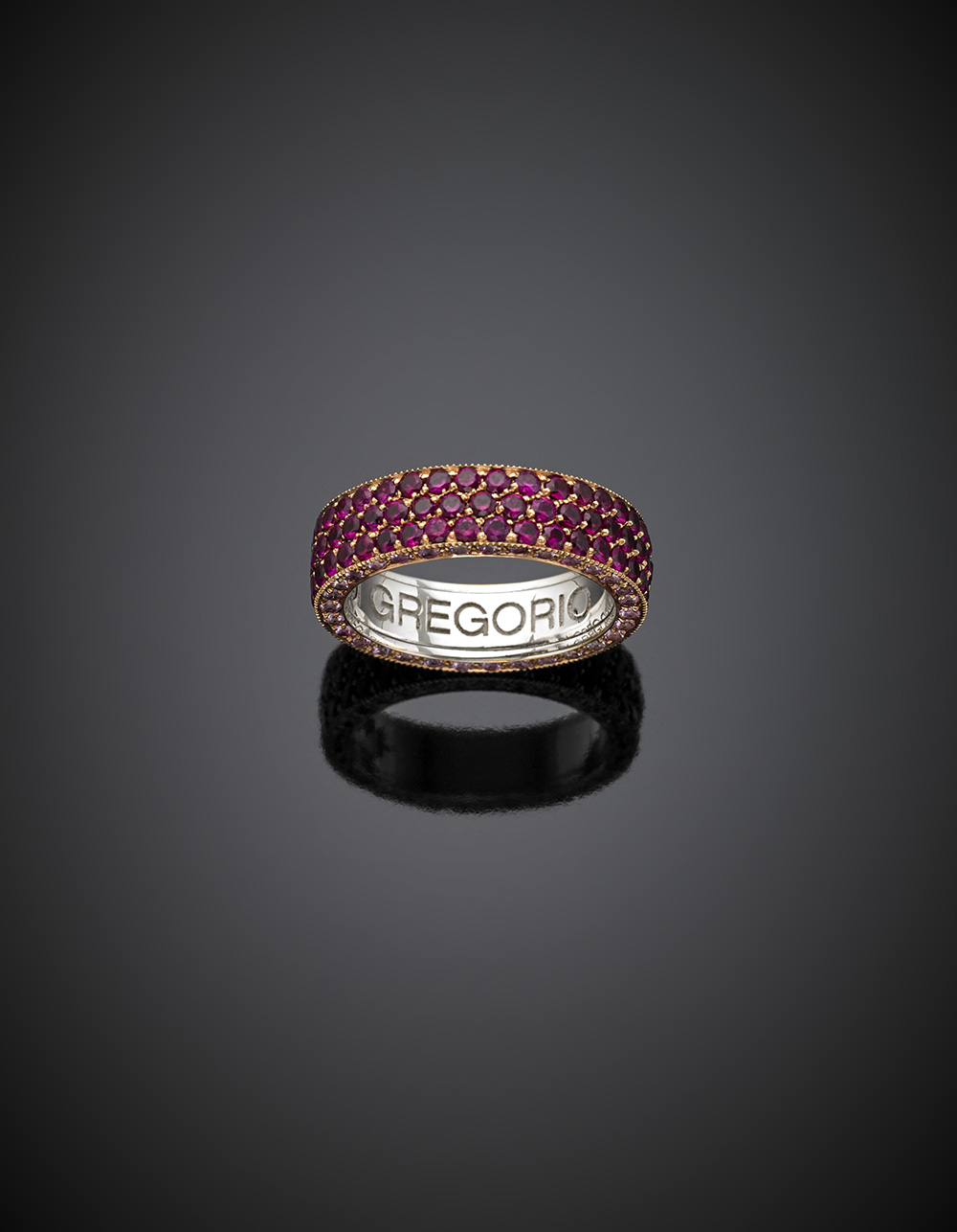 *DI GREGORIOAnello a fascia in oro rosa e bianco con tre file di rubini,...