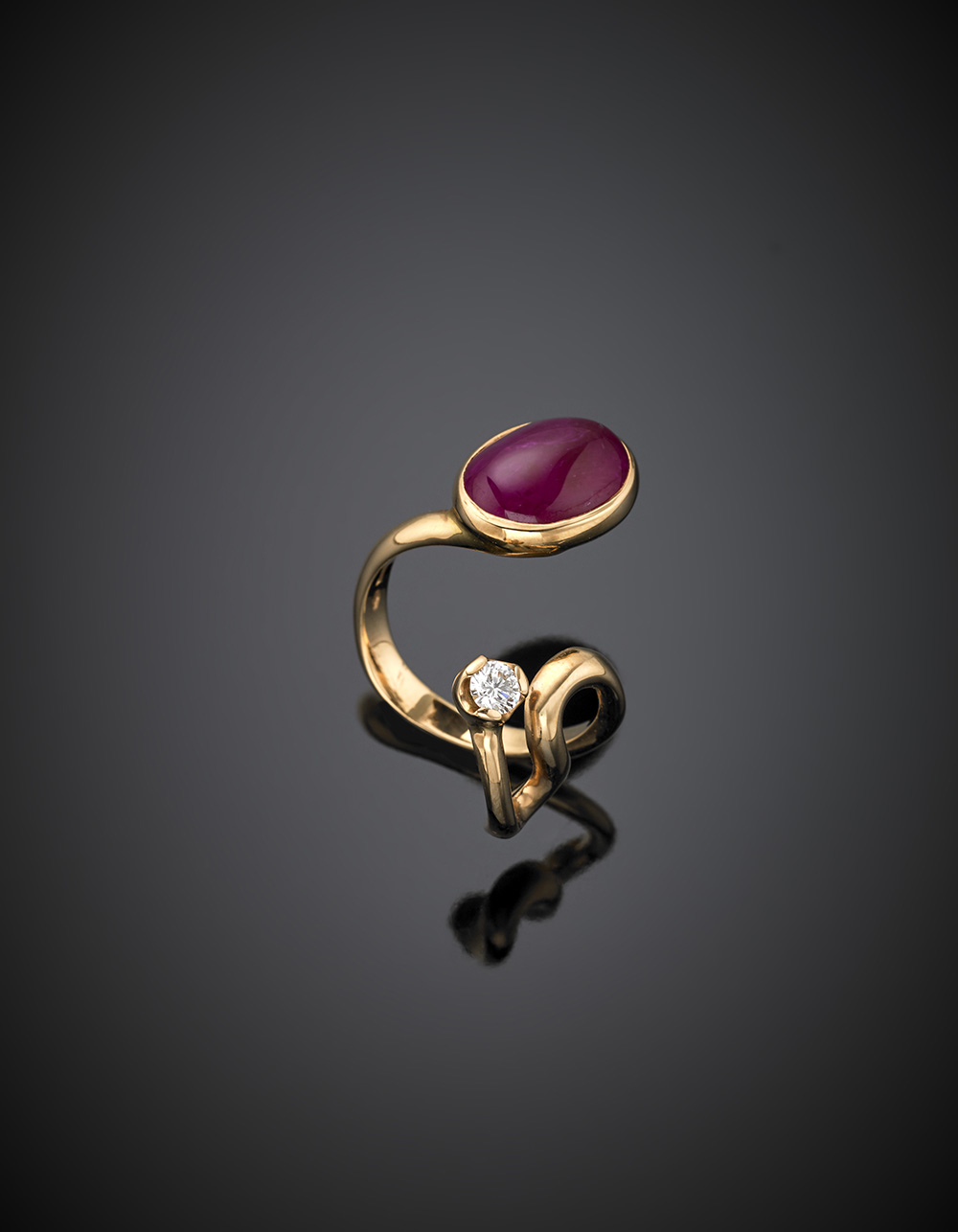 Anello in oro rosa a serpente con un rubino ovale cabochon rifinito con diamante, g 7,59 misura 14/54. Garanzia originale
