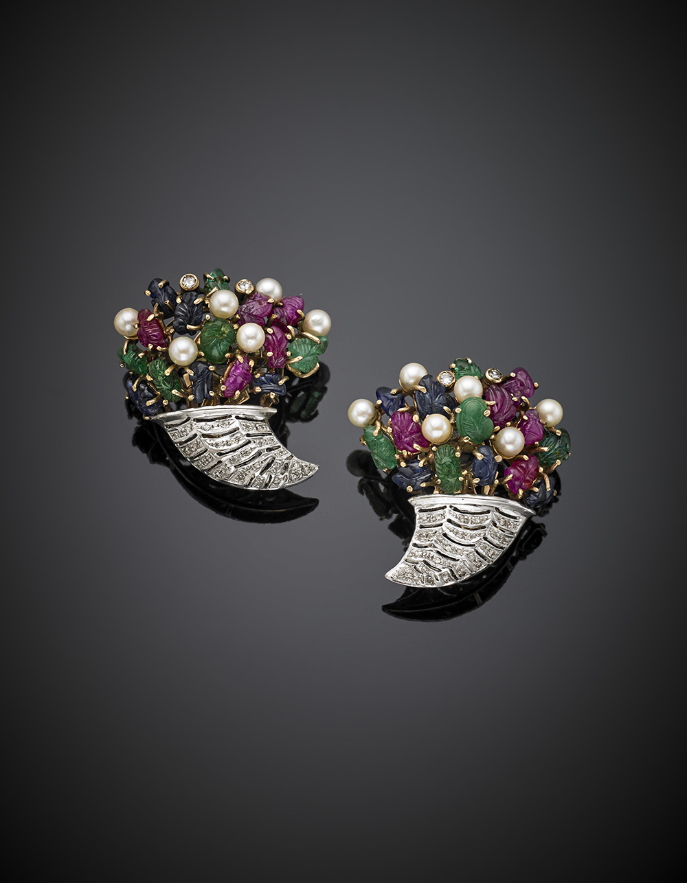 Carved emerald, ruby and sapphire with diamond and pearl bi-coloured gold "cornucopia" earrings, g 30.64, length cm 3.5, width cm 3.5, h cm 2 circa.