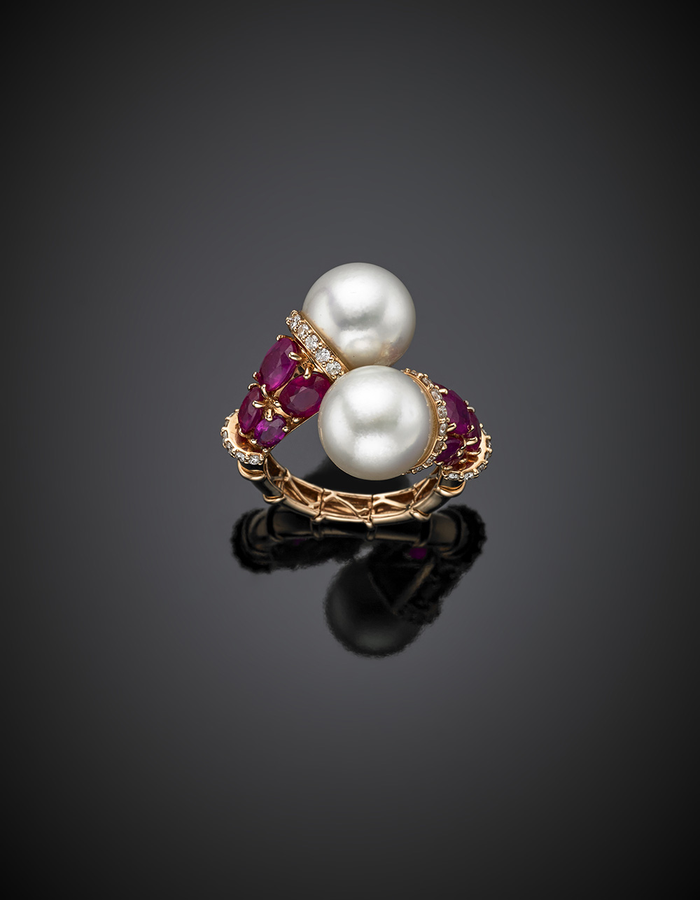 Anello a contrariè, elastico, in oro rosa lavorato a bambù con rubini a cuscino e perle, g 14,47 misura 19/59.