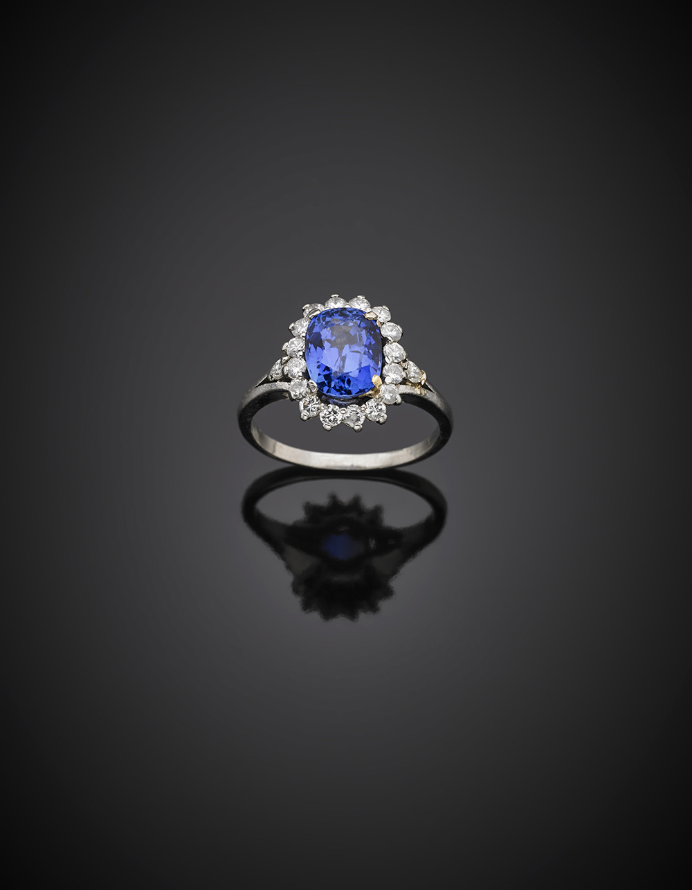 Cushion shape ct. 2.72 sapphire and diamond white gold cluster ring, g 5.48 size 11/51.