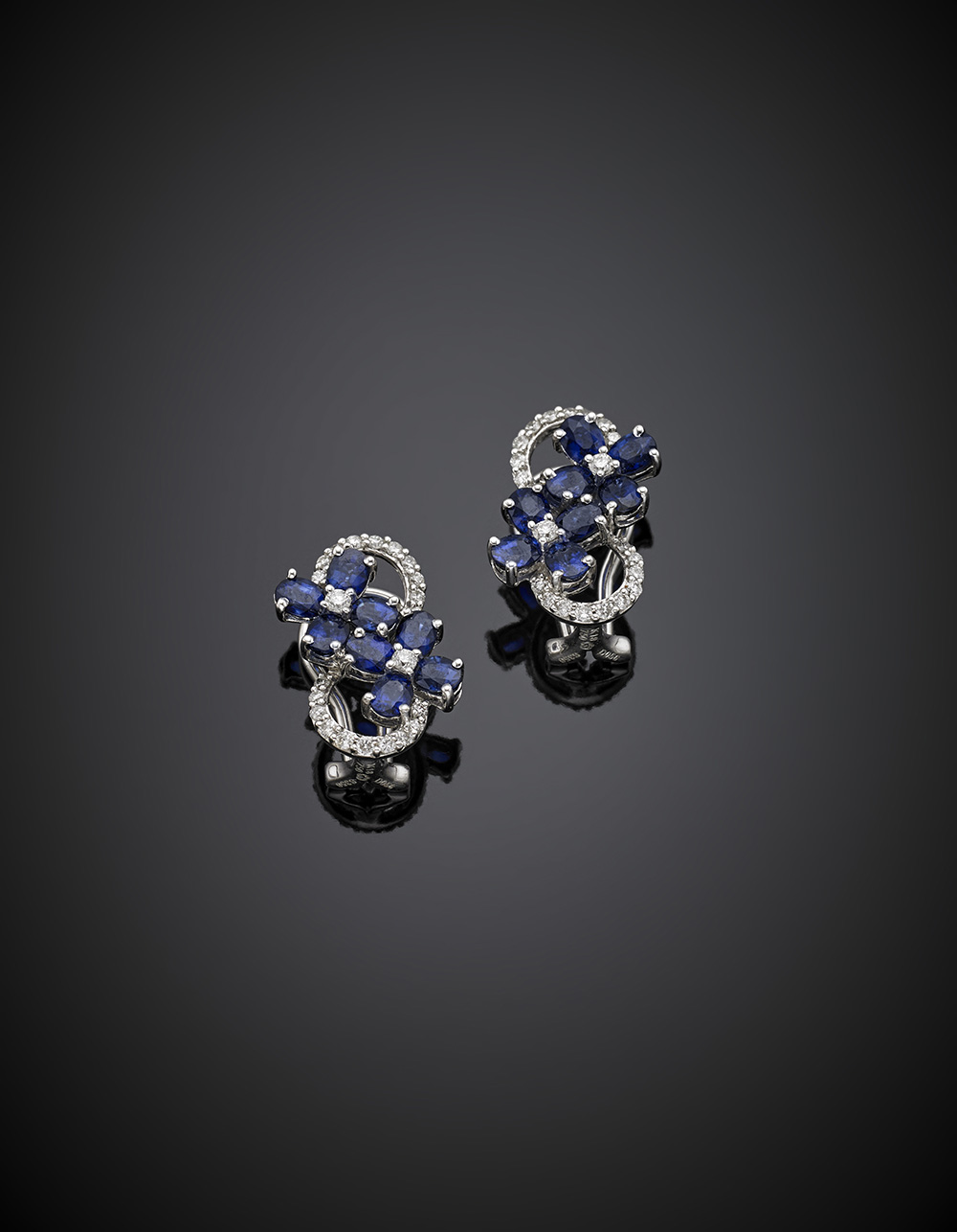 White gold diamond and sapphire flower love knot earclips, g 7.54, length cm 2, width cm 1.5 circa.