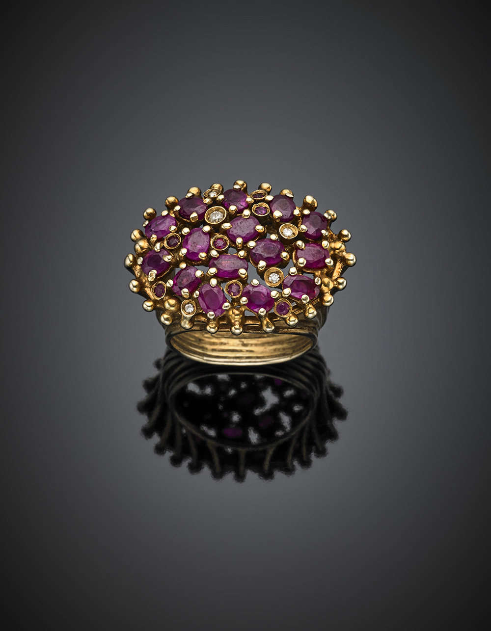Anello in oro giallo con gambo a più fili rifinito con rubini a cuscino e rotondi per complessivi ct. 3,80 circa e piccoli diamanti, g 15,08 misura 18/58.