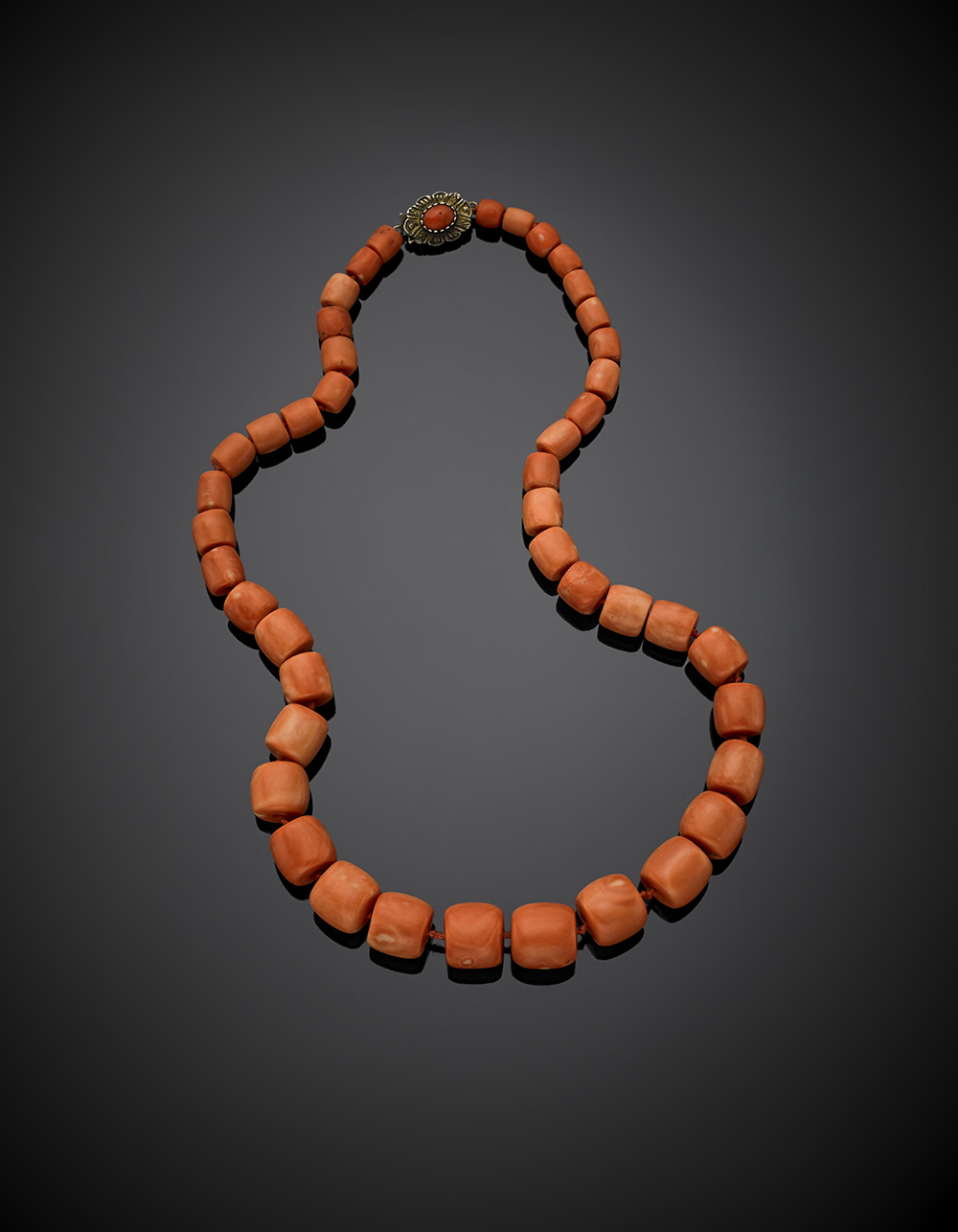 Orange coral graduated bead necklace with silver gilt and orange coral clasp, bead diam. from mm 6,35 to mm 14,65 circa, g 88.08, length cm 51 circa.