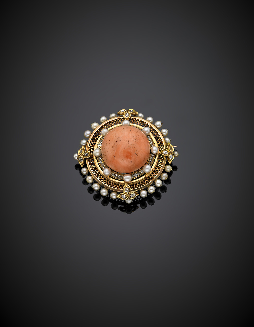 Broche in oro giallo con perle e diamanti a contornare un corallo cabochon rosa variegato, g 24,01, h cm 2,5, diam. cm 4,5 circa.
