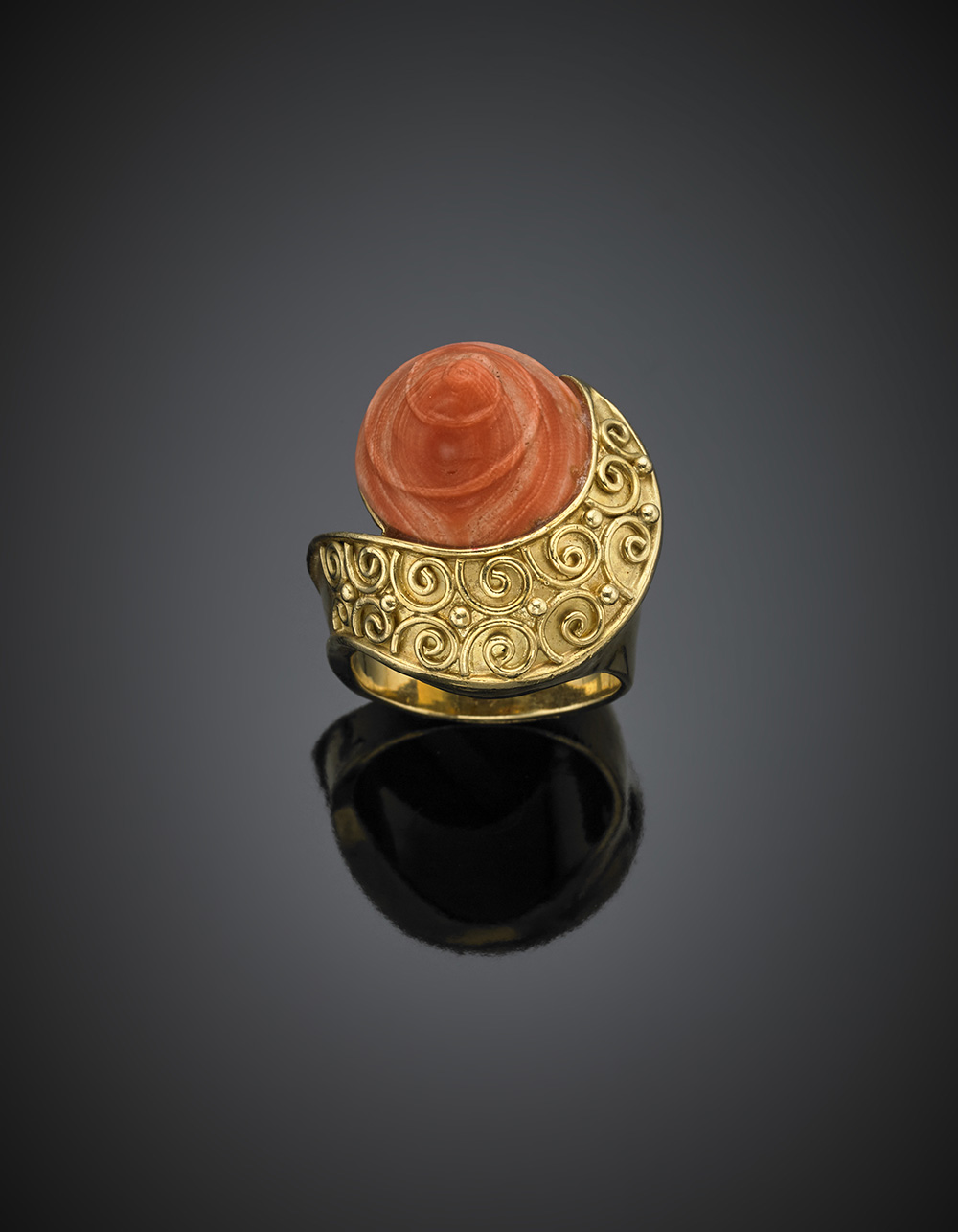 Shell like pink orangish carved coral yellow gold ring, g 21.55 size 20/60. Signed Oplontioro.