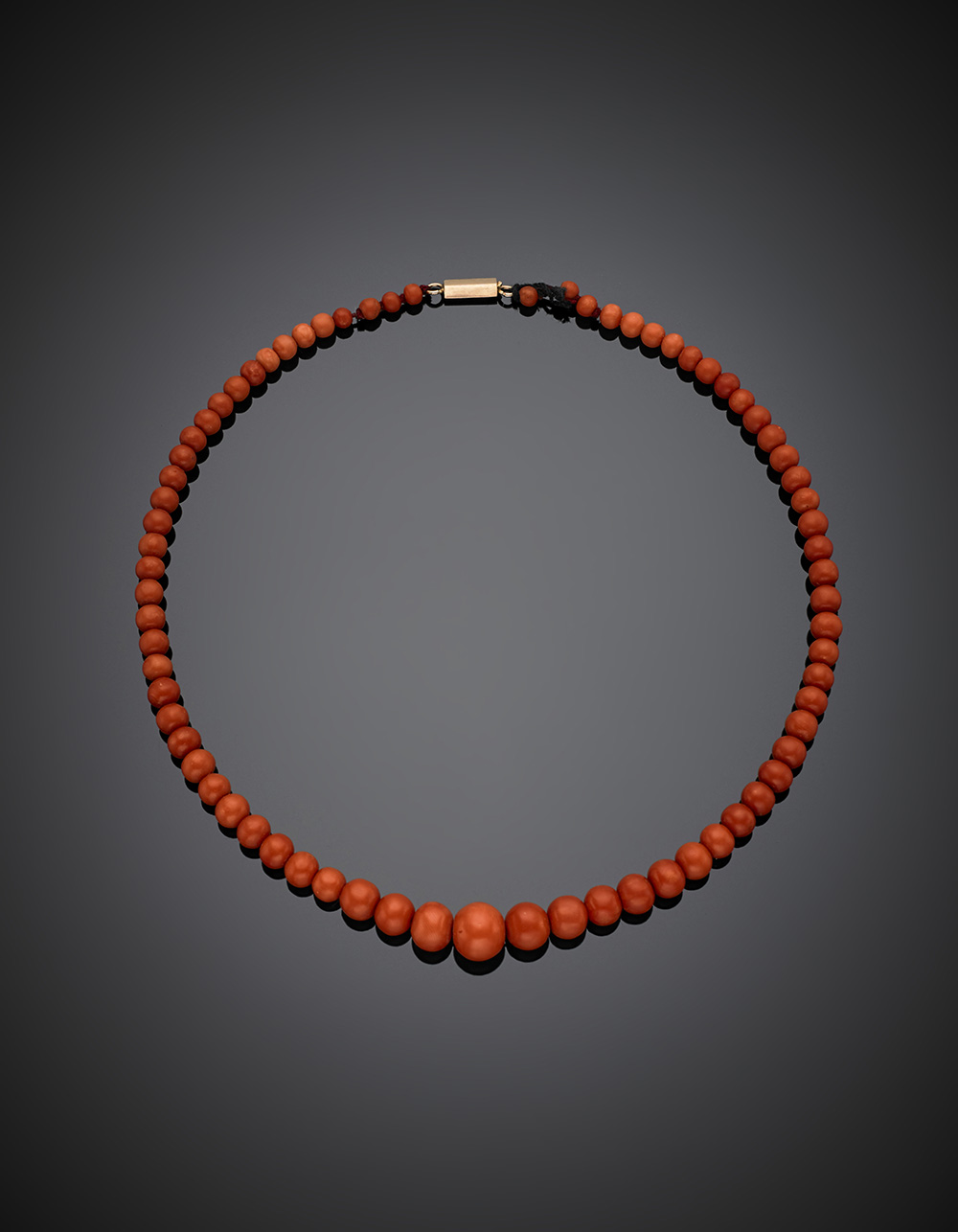 Collier a scalare di corallo arancione rotondo/ovale da mm 4 a mm 11 circa con chiusura in oro rosso, g 26,28, lungh. cm 43 circa.