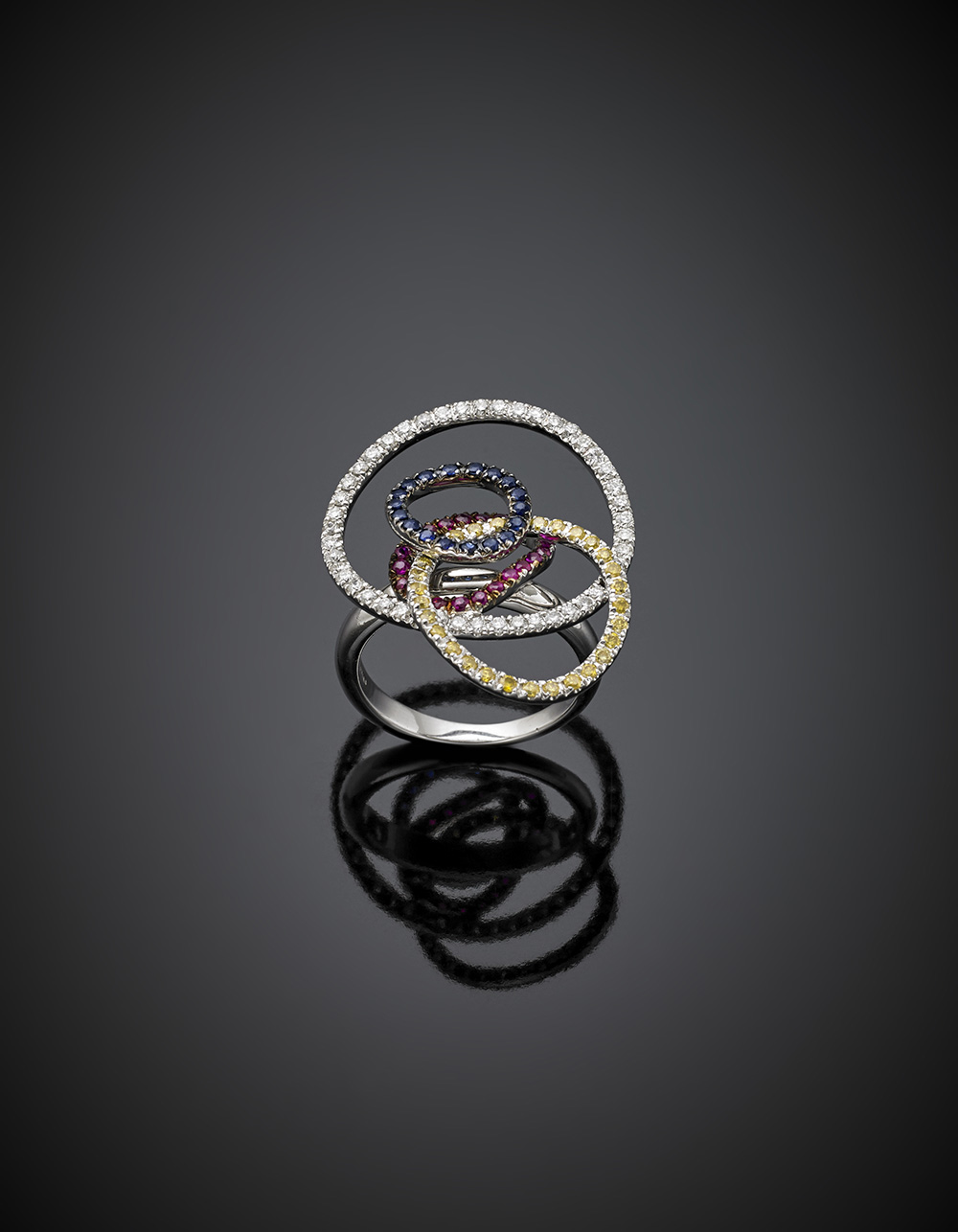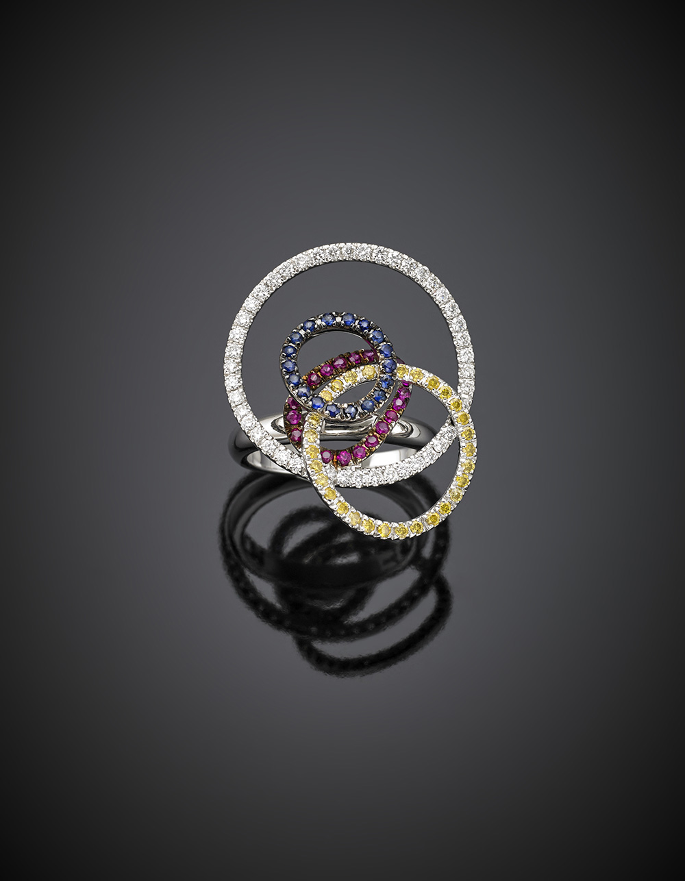 Anello in oro bianco con cerchi rifiniti in diamanti incolori, fancy, rubini e zaffiri, g 7,76 misura 13/53. Garanzia originale