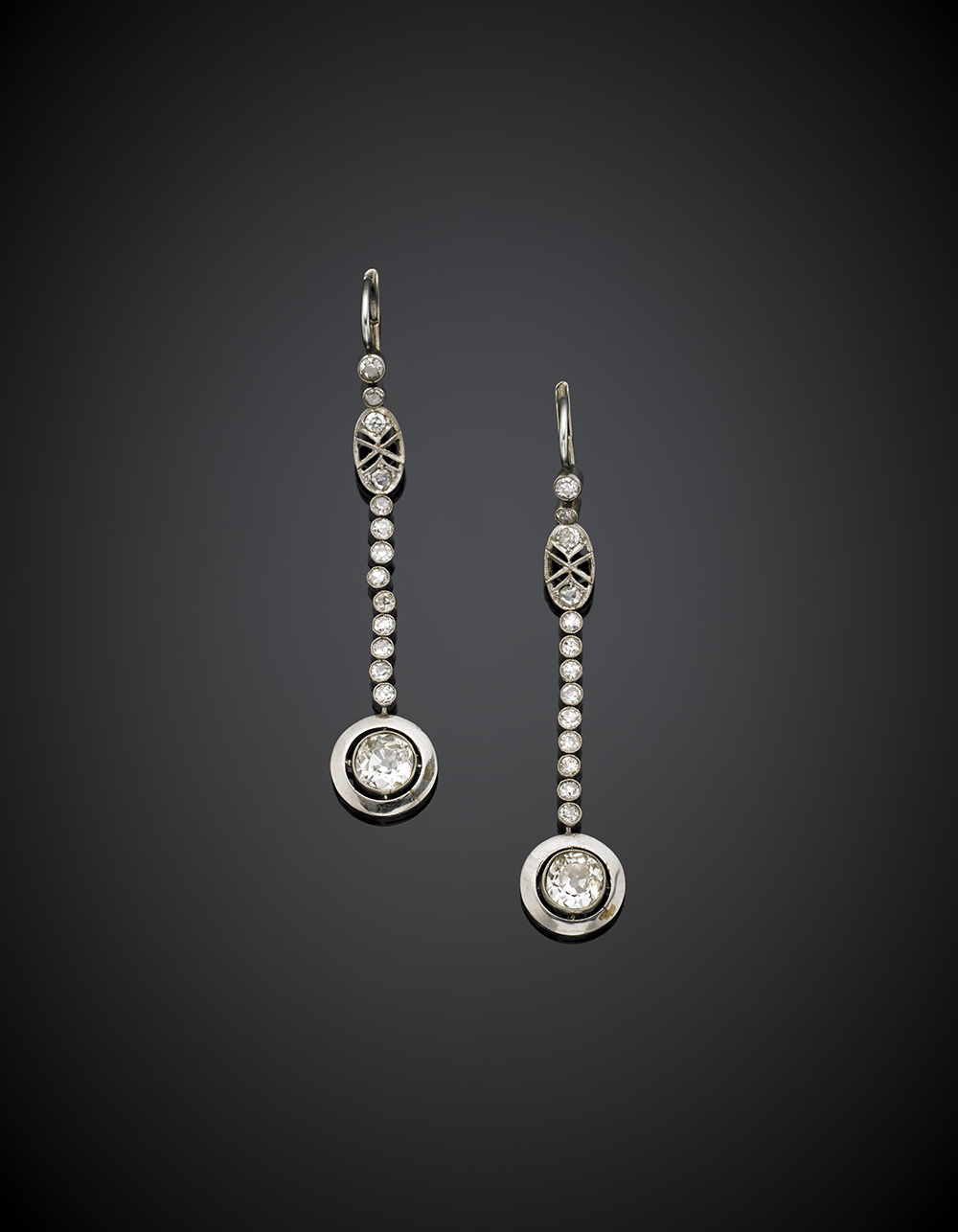 Orecchini pendenti in platino con diamanti rotondi, per complessivi ct. 1,80 circa, g 6,49, lungh. cm 5,5 circa.
