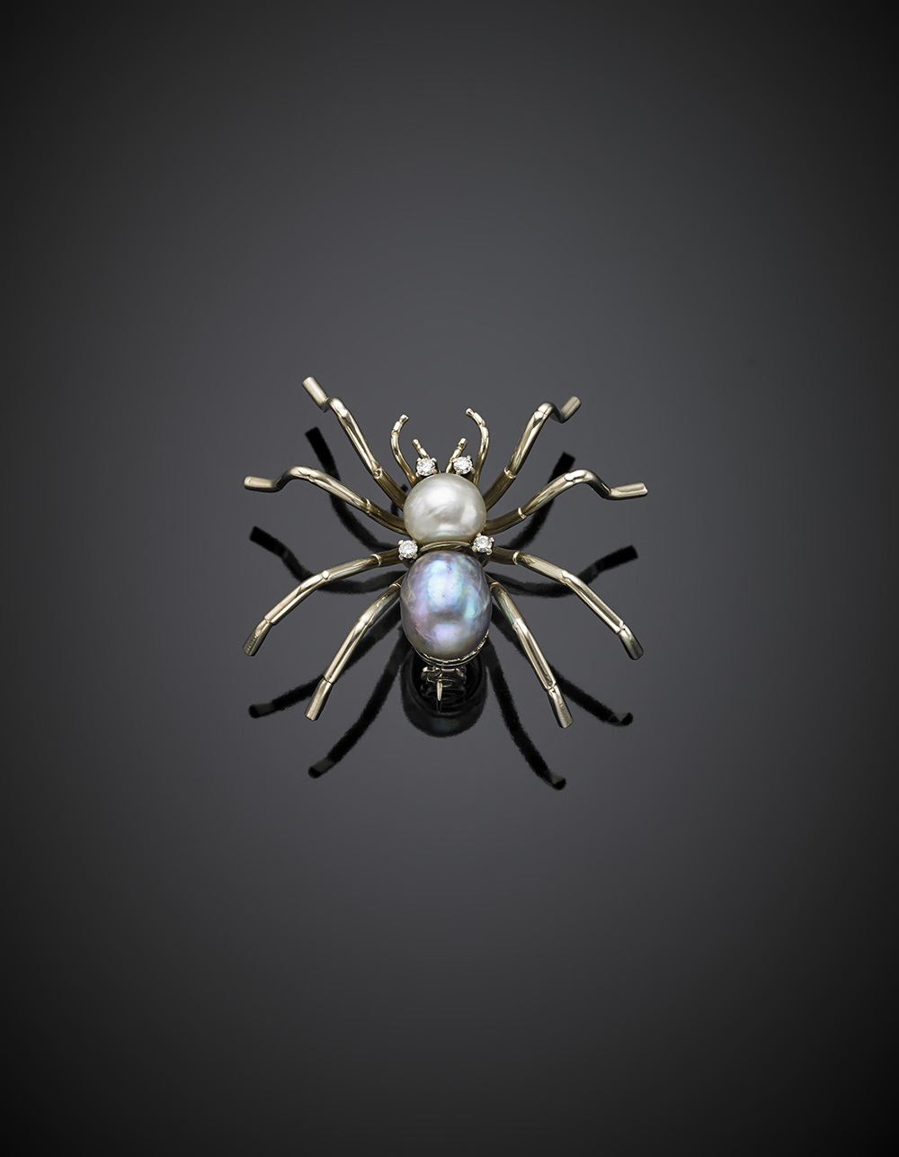 Broche a guisa di ragno in oro bianco con diamanti, perle una bianca e una...