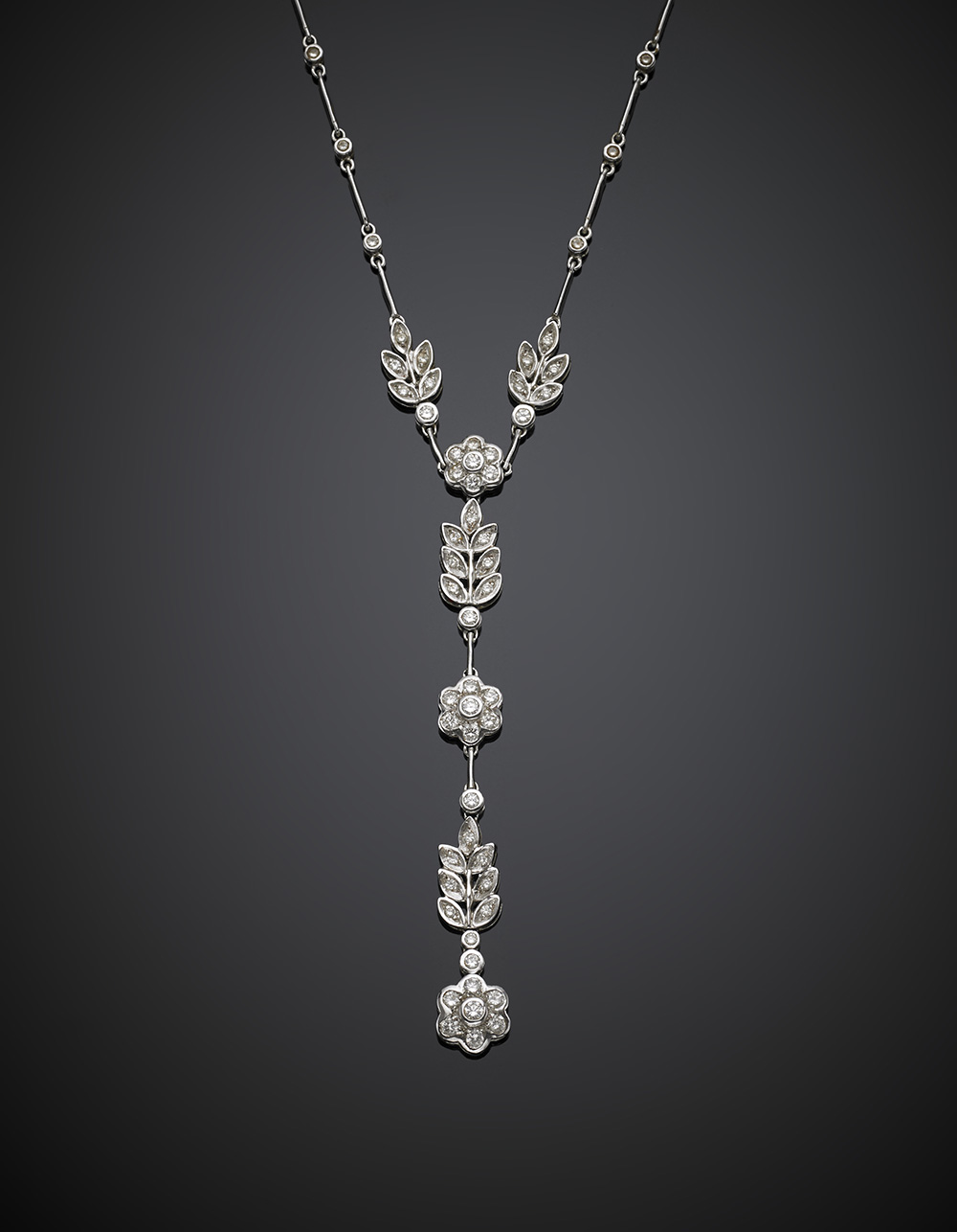 Collier in oro bianco con al centro un pendente tutto rifinito in diamanti rotondi, lungh. centrale cm 8, g 16,88, lungh. cm 44 circa.