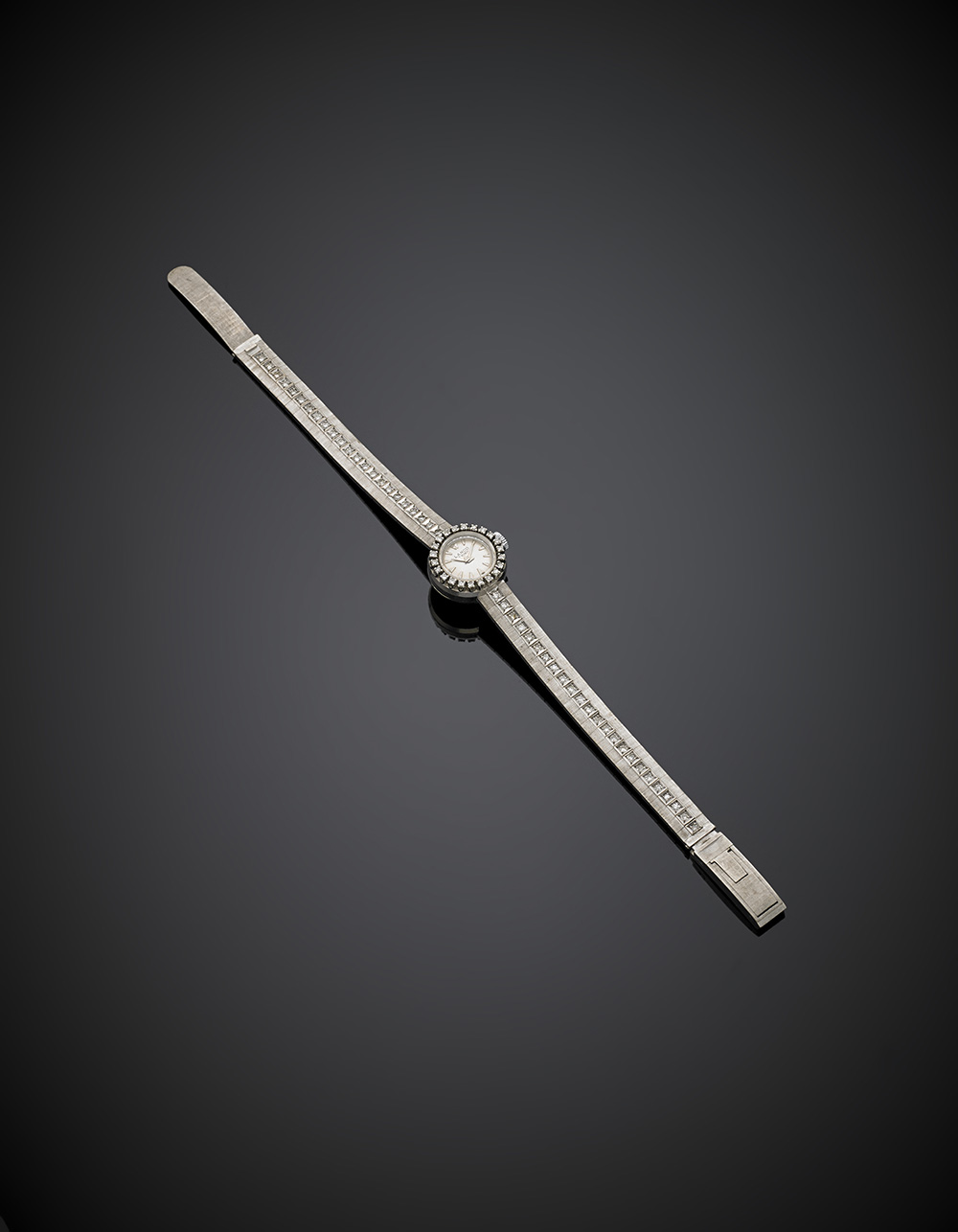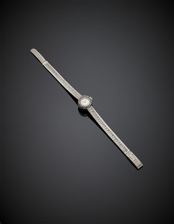 Orologio da donna da polso in oro bianco satinato e diamanti rotondi, g 28,71, lungh. cm 18,5 circa. Firmato LANCO, BREVET.