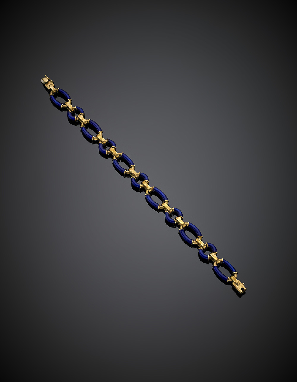 Bracciale in oro giallo rigato ad anelli rifinito in smalto blu, g 37,19, lungh. cm 19,70 circa. Marcato 118 MI. Custodia originale (lievi difetti)
