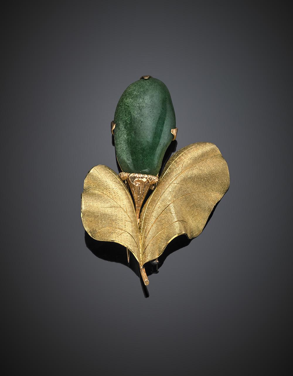 Broche in oro giallo cesellato a guisa di bocciolo con avventurina verde cabochon di mm 32x20x6,88, g 25,98, lungh. cm 7, largh. cm 5 circa. Firmato M.Buccellati.