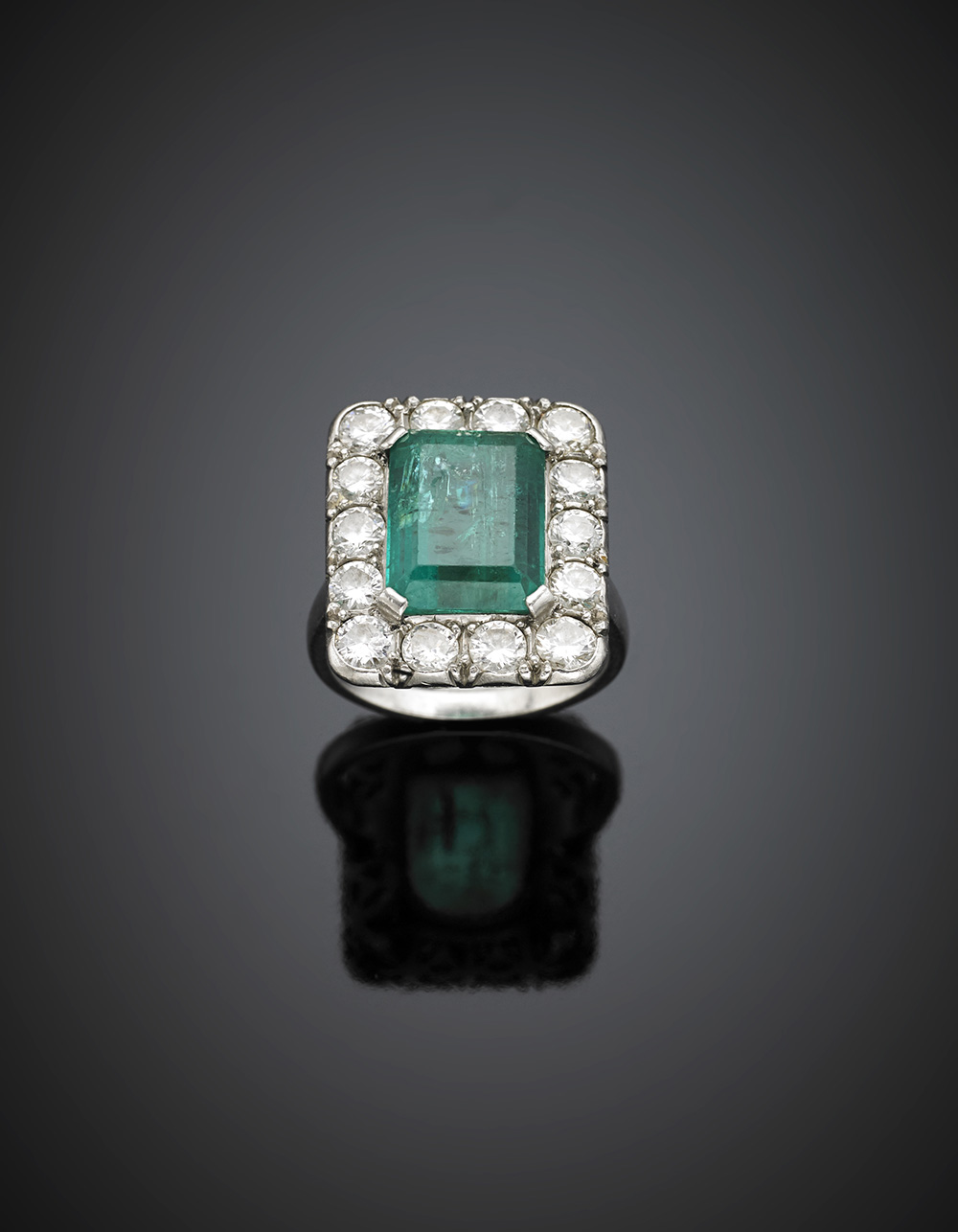 Anello in oro bianco con smeraldo ottagonale centrale di ct. 3,80 circa e diamanti rotondi a contornarlo per complessivi ct. 1,70 circa, g 8,05 misura 8/48.
