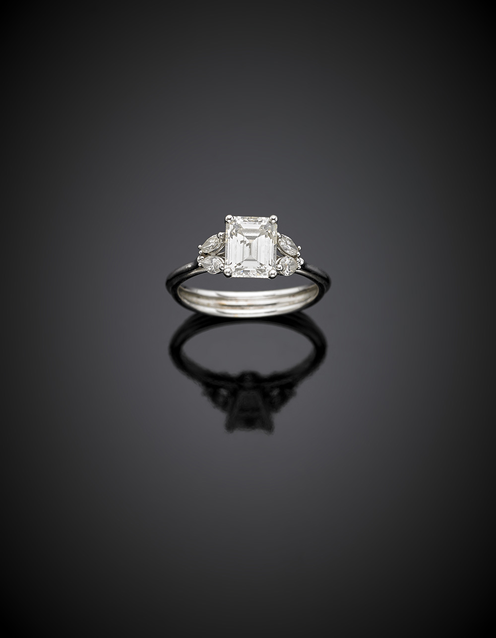 Lot 792 | Anello in oro bianco con diamante di ct. 1,20 circa taglio a smeraldo e...