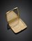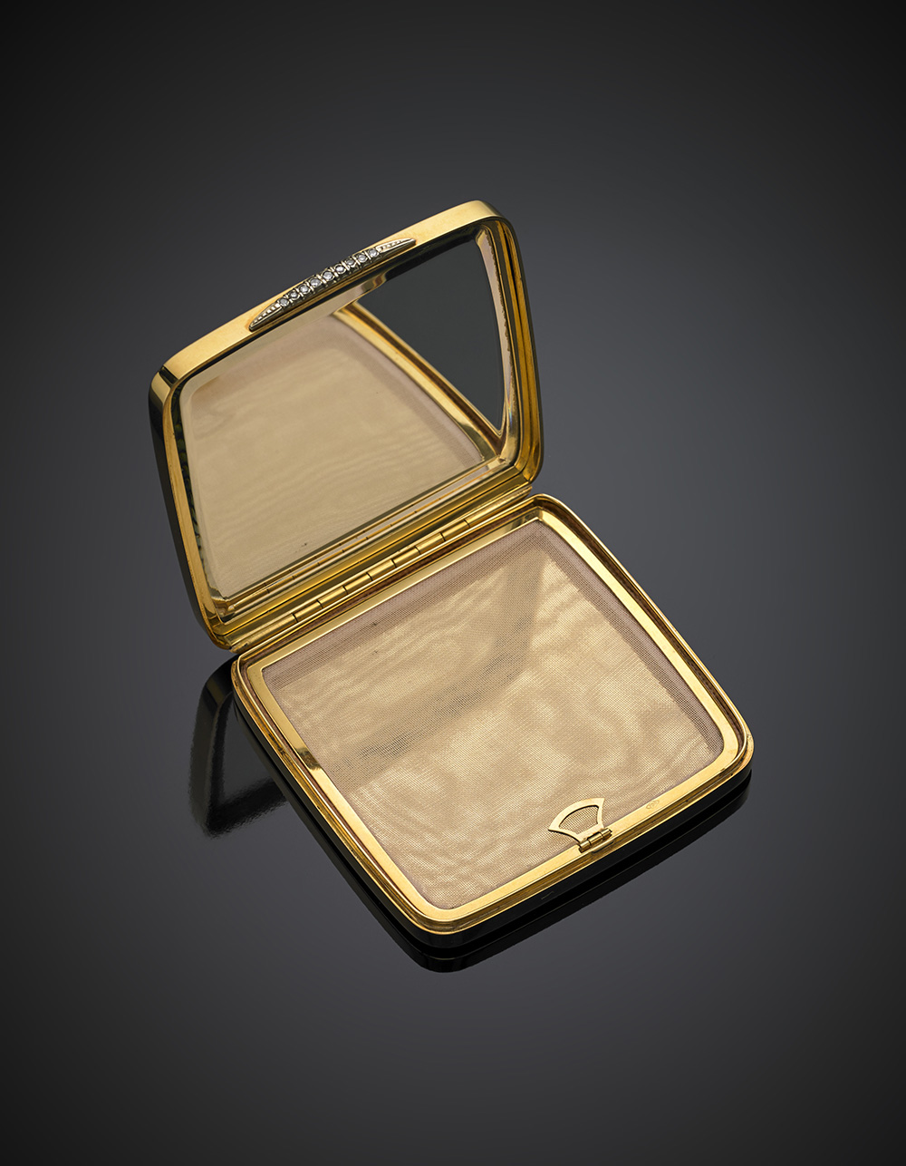 *Portacipria quadrato con spigoli arrotondati in oro giallo con fregio in oro bianco e diamanti a guisa di chiusura, lato cm 6,90, g 152,93.