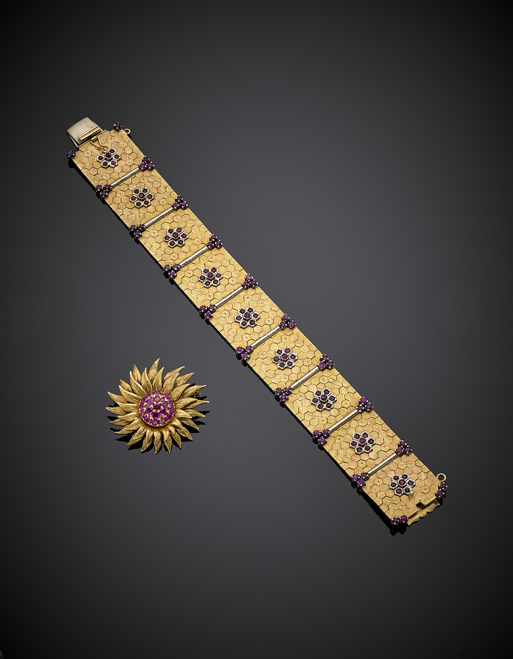 Bracciale e spilla in oro giallo con rubini per complessivi ct. 9 circa. Bracciale lunghezza 20,5 cm e larghezza 2.5 cm circa. Spilla 3.8 cm circa, complessivi g 94,85.