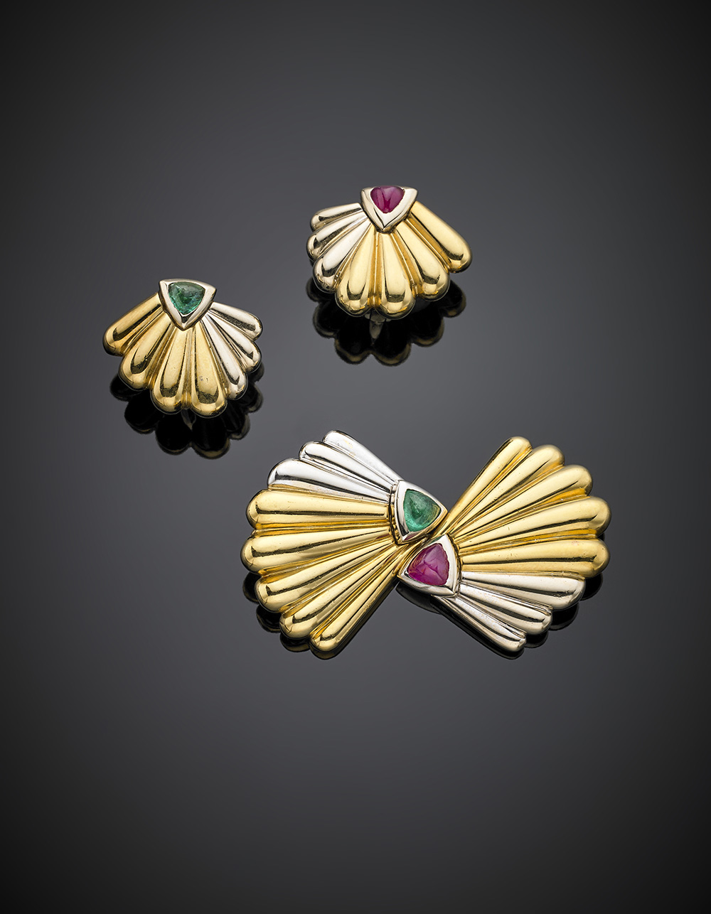 Demi-parure composta da broche e orecchini a lobo con clip in oro giallo e bianco, smeraldi per complessivi ct. 1 circa e rubini per complessivi ct. 1,50 circa, complessivi g 47,87. Firmato FARAONE. In scatola e confezione originali