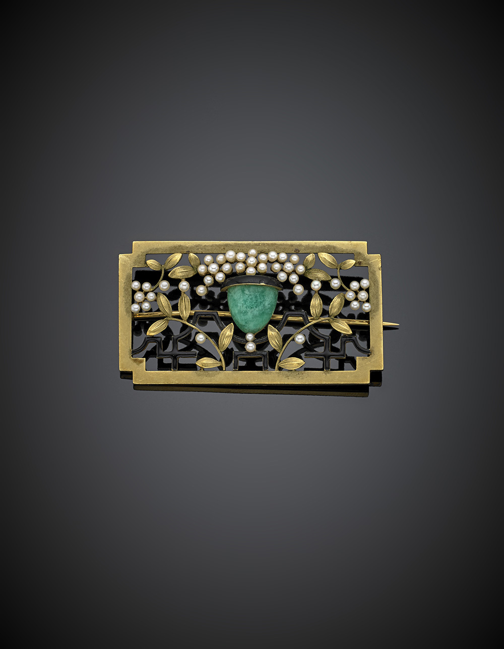 Spilla rettangolare in oro giallo microperle e probabile variscite verde a formare un vaso con foglie e fiori, g 8,83, largh. cm 4,40, h cm 2,50 circa.