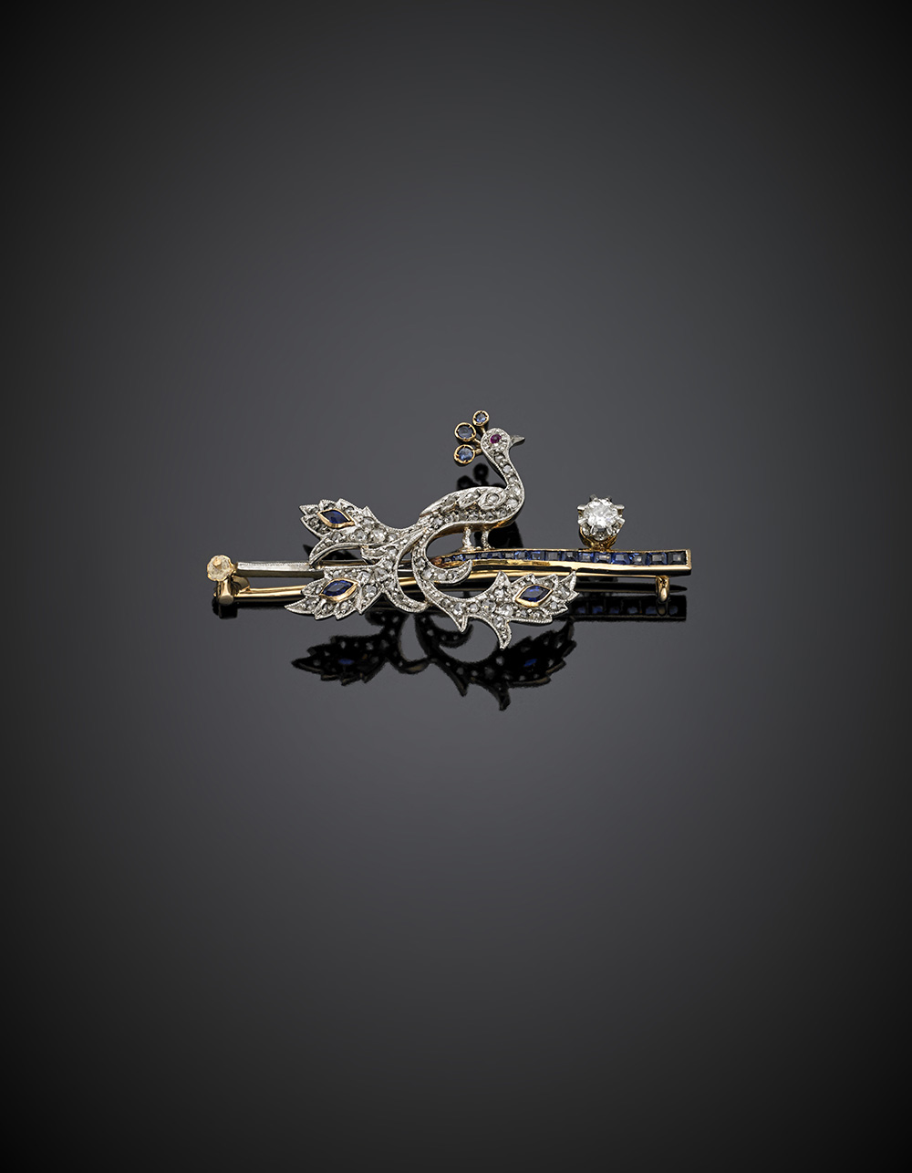 Spilla in oro bianco e giallo a guisa di pavone con zaffiri diamanti e rubino, g 5,91, lungh. cm 4,4, h cm 2,6 circa.
