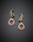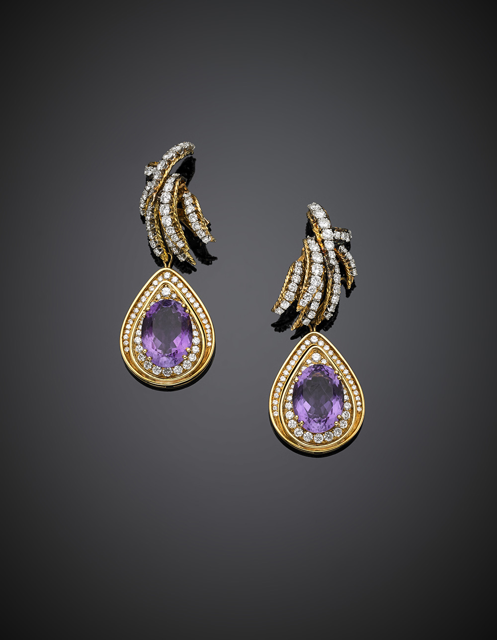 Orecchini pendenti in oro giallo e bianco rifiniti con diamanti per complessivi ct. 3,60 circa, il pendente smontabile non firmato rifinito con ametiste ovali per complessivi ct. 28 circa, g 44,17, lungh. cm 6,8 circa. Firmati Faraone.