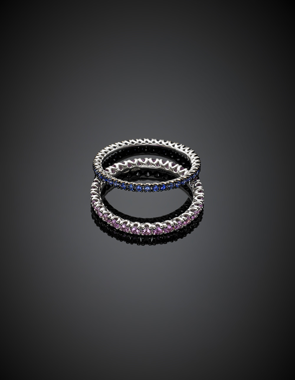 Lot of two white gold blue and pink sapphire eternity rings,, in all ct. 1.53 circa, in all g 2.97 size 14/54. Original Guarantee