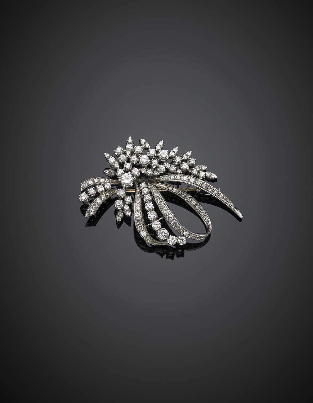 White gold diamond posy and ribbon brooch,, in all ct. 1.40 circa, g 13.64, length cm 5.20 circa.