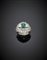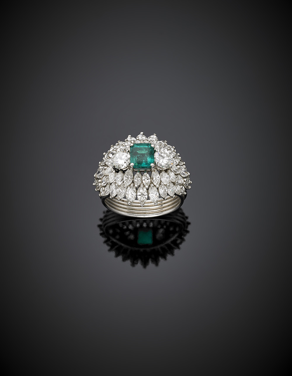 Anello in oro bianco bombato con diamanti a navette e due rotondi a contornare uno smeraldo carrè, diamanti per complessivi ct. 4,00 circa, g 12,07 misura 18/57.