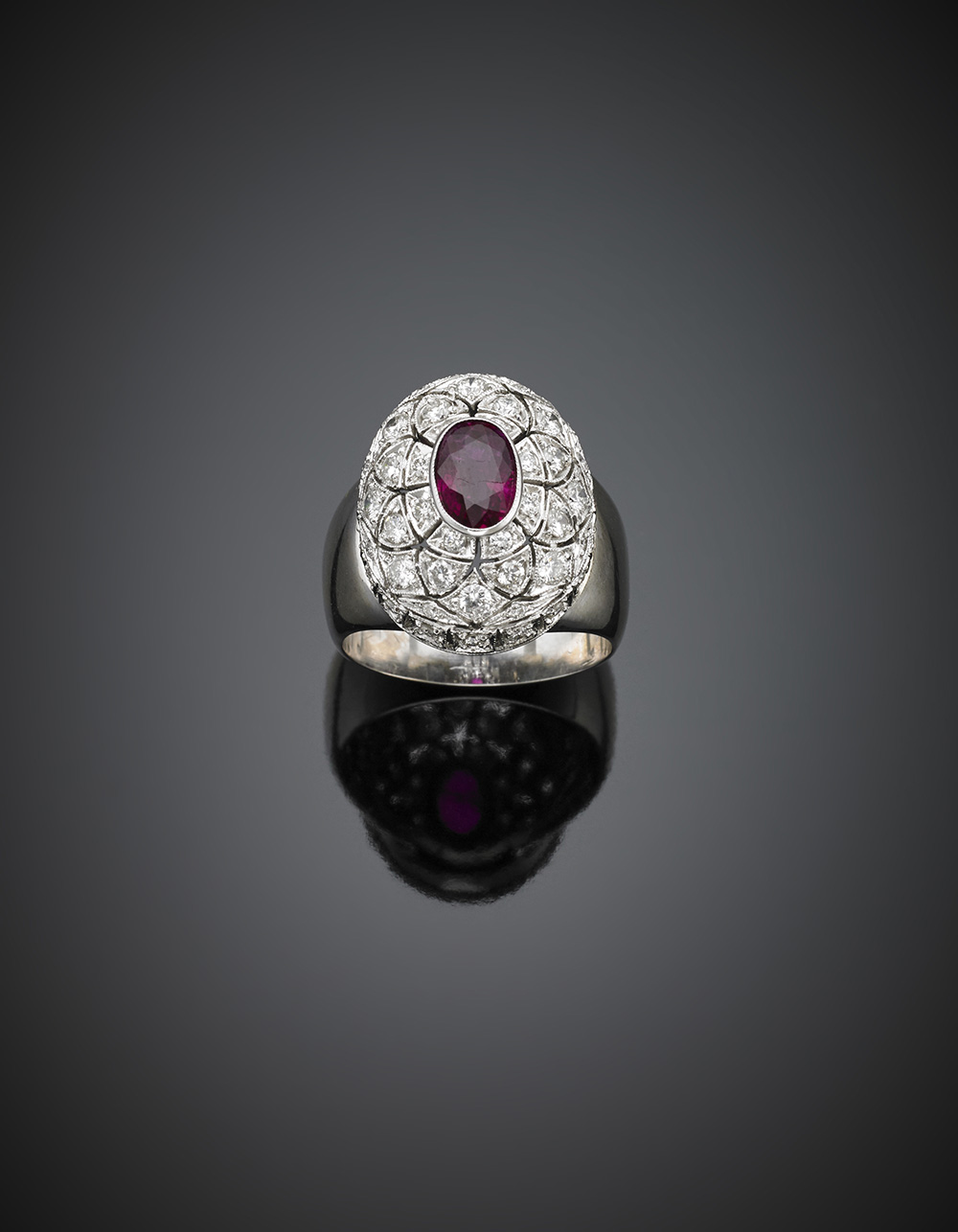 Anello in oro bianco a cupola con diamanti per complessivi ct. 0,55 circa ed al centro un rubino ovale di ct. 1,20 circa, g 11,78 misura 15/55.